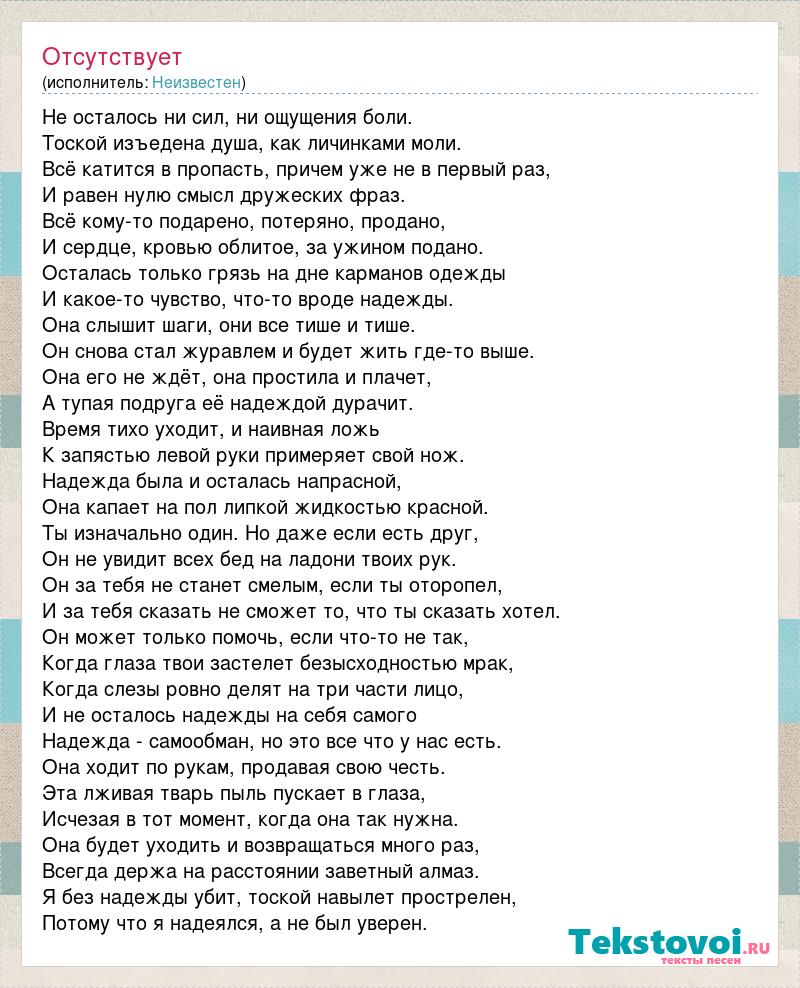 Не осталось ни сил, ни ощущения боли. Тоской изъедена душа, как личинками моли. Всё катится в пропасть, причем уже не в первый раз, И равен нулю смысл дружеских фраз. Всё кому-то подарено, потеряно, продано, И сердце, кровью облитое, за ужином подано. Осталась только грязь на дне карманов одежды И какое-то чувство, что-то вроде надежды. Она слышит шаги, они все тише и тише. Он снова стал журавлем и будет жить где-то выше. Она его не ждёт, она простила и плачет, А тупая подруга её надеждой дурачит. Время тихо уходит, и наивная ложь К запястью левой руки примеряет свой нож. Надежда была и осталась напрасной, Она капает на пол липкой жидкостью красной. Ты изначально один. Но даже если есть друг, Он не увидит всех бед на ладони твоих рук. Он за тебя не станет смелым, если ты оторопел, И за тебя сказать не сможет то, что ты сказать хотел. Он может только помочь, если что-то не так, Когда глаза твои застелет безысходностью мрак, Когда слезы ровно делят на три части лицо, И не осталось надежды на себя самого Надежда - самообман, но это все что у нас есть. Она ходит по рукам, продавая свою честь. Эта лживая тварь пыль пускает в глаза, Исчезая в тот момент, когда она так нужна. Она будет уходить и возвращаться много раз, Всегда держа на расстоянии заветный алмаз. Я без надежды убит, тоской навылет прострелен, Потому что я надеялся, а не был уверен.