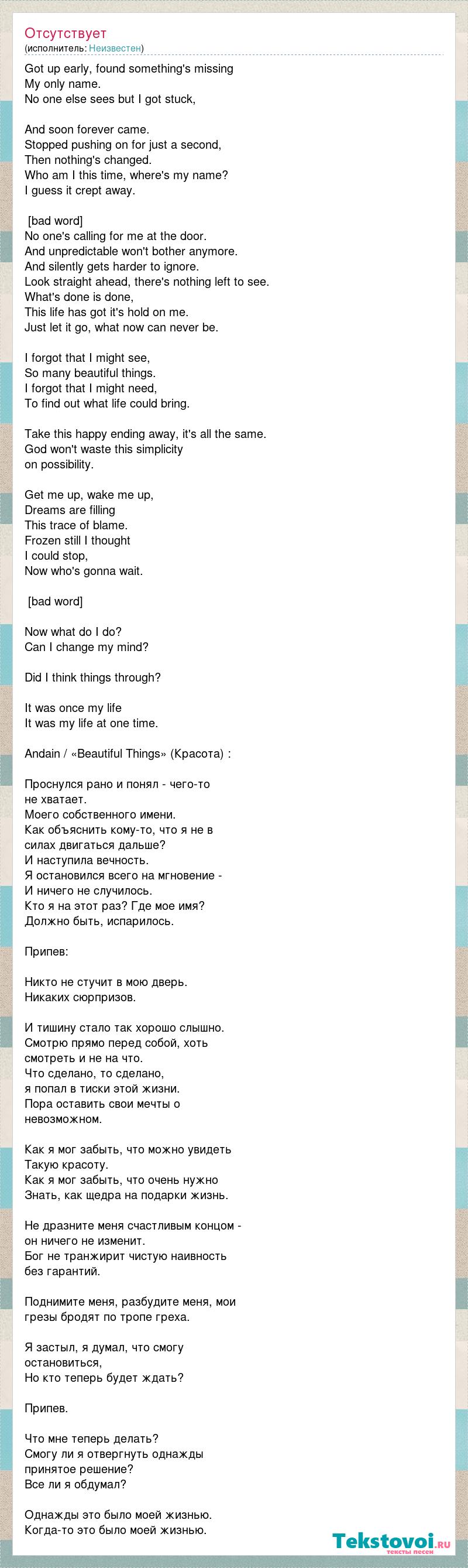 Got up early, found something's missing My only name. No one else sees but I got stuck, And soon forever came. Stopped pushing on for just a second, Then nothing's changed. Who am I this time, where's my name? I guess it crept away. [bad word] No one's calling for me at the door. And unpredictable won't bother anymore. And silently gets harder to ignore. Look straight ahead, there's nothing left to see. What's done is done, This life has got it's hold on me. Just let it go, what now сan never be. I forgot that I might see, So many beautiful things. I forgot that I might need, To find out what life could bring. Take this happy ending away, it's all the same. God won't waste this simplicity on possibility. Get me up, wake me up, Dreams are filling This trace of blame. Frozen still I thought I could stop, Now who's gonna wait. [bad word] Now what do I do? Can I change my mind? Did I think things through? It was once my life It was my life at one time. Andain / «Beautiful Things» (Красота) : Проснулся рано и понял - чего-то не хватает. Моего собственного имени. Как объяснить кому-то, что я не в силах двигаться дальше? И наступила вечность. Я остановился всего на мгновение - И ничего не случилось. Кто я на этот раз? Где мое имя? Должно быть, испарилось. Припев: Никто не стучит в мою дверь. Никаких сюрпризов. И тишину стало так хорошо слышно. Смотрю прямо перед собой, хоть смотреть и не на что. Что сделано, то сделано, я попал в тиски этой жизни. Пора оставить свои мечты о невозможном. Как я мог забыть, что можно увидеть Такую красоту. Как я мог забыть, что очень нужно Знать, как щедра на подарки жизнь. Не дразните меня счастливым концом - он ничего не изменит. Бог не транжирит чистую наивность без гарантий. Поднимите меня, разбудите меня, мои грезы бродят по тропе греха. Я застыл, я думал, что смогу остановиться, Но кто теперь будет ждать? Припев. Что мне теперь делать? Смогу ли я отвергнуть однажды принятое решение? Все ли я обдумал? Однажды это было моей жизнью. Когда-то это было моей жизнью.