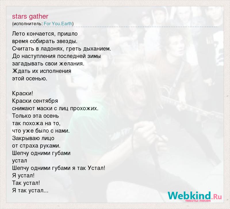 Лето кончается, пришло время собирать звезды. Считать в ладонях, греть дыханием. До наступления последней зимы загадывать свои желания. Ждать их исполнения этой осенью. Краски! Краски сентября снимают маски с лиц прохожих. Только эта осень так похожа на то, что уже было с нами. Закрываю лицо от страха руками. Шепчу одними губами устал Шепчу одними губами я так Устал! Я устал! Так устал! Я так устал...