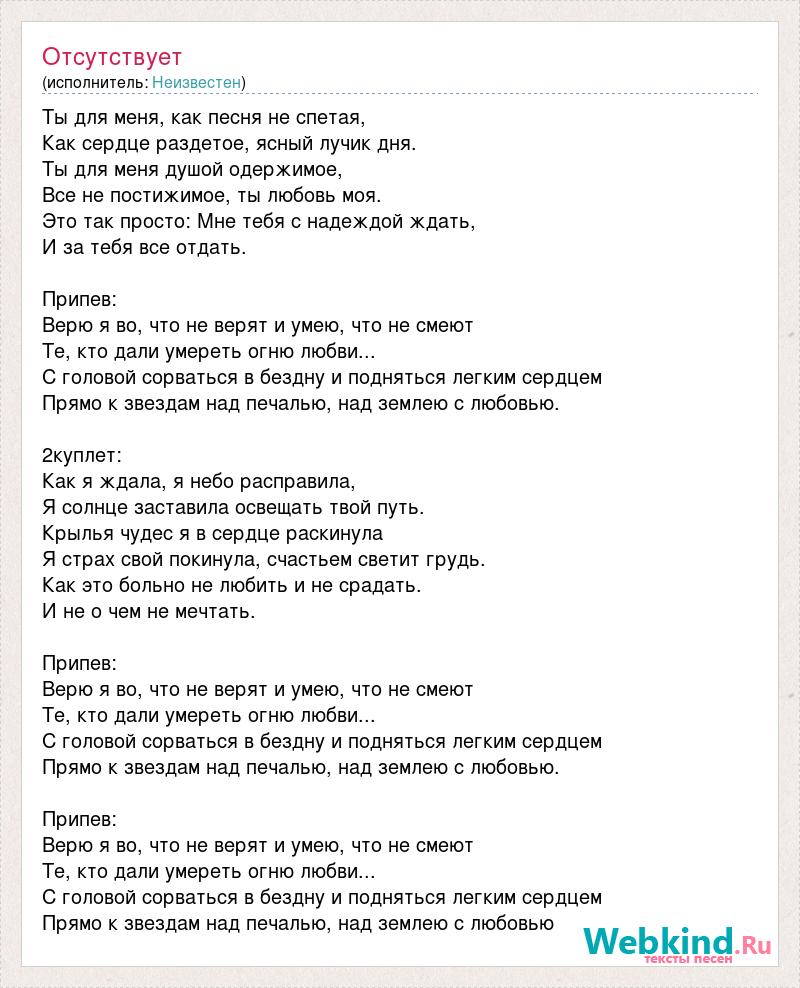 Ты для меня, как песня не спетая, Как сердце раздетое, ясный лучик дня. Ты для меня душой одержимое, Все не постижимое, ты любовь моя. Это так просто: Мне тебя с надеждой ждать, И за тебя все отдать. Припев: Верю я во, что не верят и умею, что не смеют Те, кто дали умереть огню любви... С головой сорваться в бездну и подняться легким сердцем Прямо к звездам над печалью, над землею с любовью. 2куплет: Как я ждала, я небо расправила, Я солнце заставила освещать твой путь. Крылья чудес я в сердце раскинула Я страх свой покинула, счастьем светит грудь. Как это больно не любить и не срадать. И не о чем не мечтать. Припев: Верю я во, что не верят и умею, что не смеют Те, кто дали умереть огню любви... С головой сорваться в бездну и подняться легким сердцем Прямо к звездам над печалью, над землею с любовью. Припев: Верю я во, что не верят и умею, что не смеют Те, кто дали умереть огню любви... С головой сорваться в бездну и подняться легким сердцем Прямо к звездам над печалью, над землею с любовью