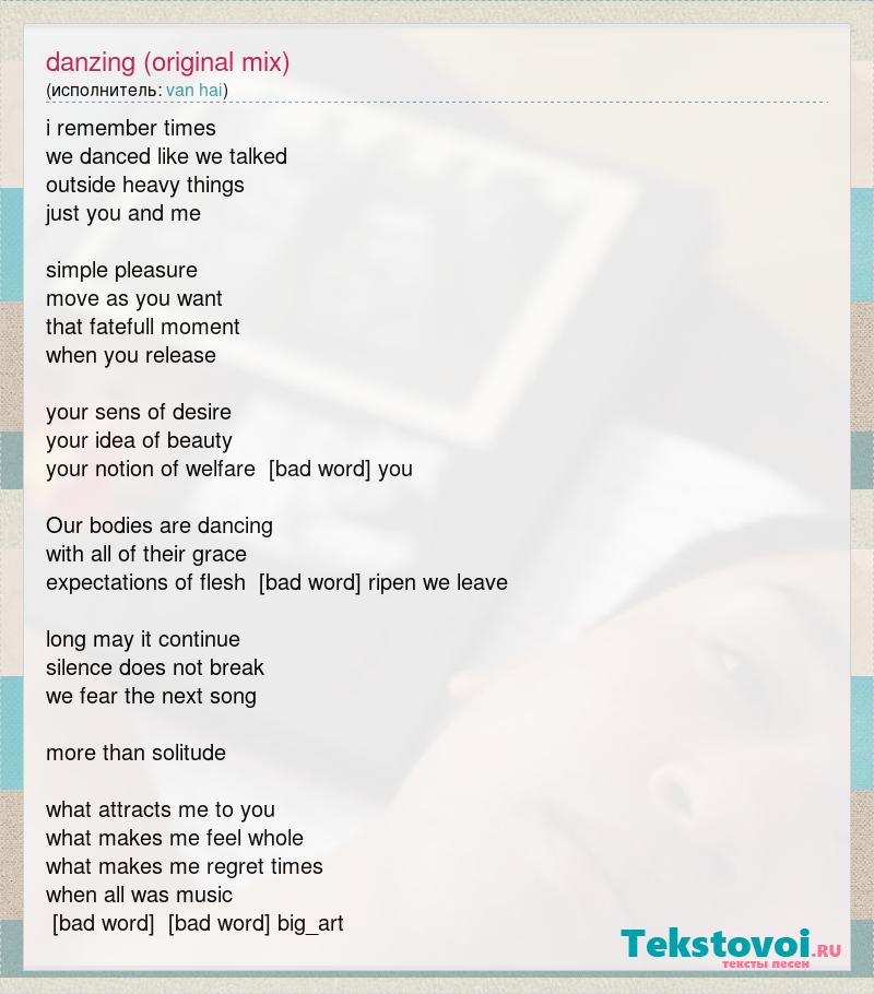 i remember times we danced like we talked outside heavy things just you and me simple pleasure move as you want that fatefull moment when you release your sens of desire your idea of beauty your notion of welfare [bad word] you Our bodies are dancing with all of their grace expectations of flesh [bad word] ripen we leave long may it continue silence does not break we fear the next song more than solitude what attracts me to you what makes me feel whole what makes me regret times when all was music [bad word] [bad word] big_art