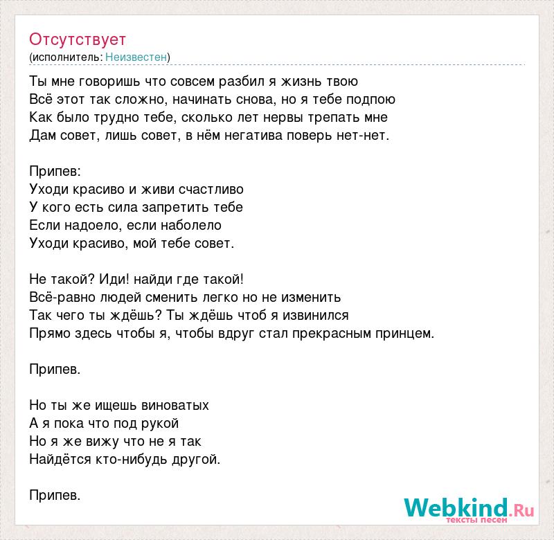 Ты мне говоришь что совсем разбил я жизнь твою Всё этот так сложно, начинать снова, но я тебе подпою Как было трудно тебе, сколько лет нервы трепать мне Дам совет, лишь совет, в нём негатива поверь нет-нет. Припев: Уходи красиво и живи счастливо У кого есть сила запретить тебе Если надоело, если наболело Уходи красиво, мой тебе совет. Не такой? Иди! найди где такой! Всё-равно людей сменить легко но не изменить Так чего ты ждёшь? Ты ждёшь чтоб я извинился Прямо здесь чтобы я, чтобы вдруг стал прекрасным принцем. Припев. Но ты же ищешь виноватых А я пока что под рукой Но я же вижу что не я так Найдётся кто-нибудь другой. Припев.