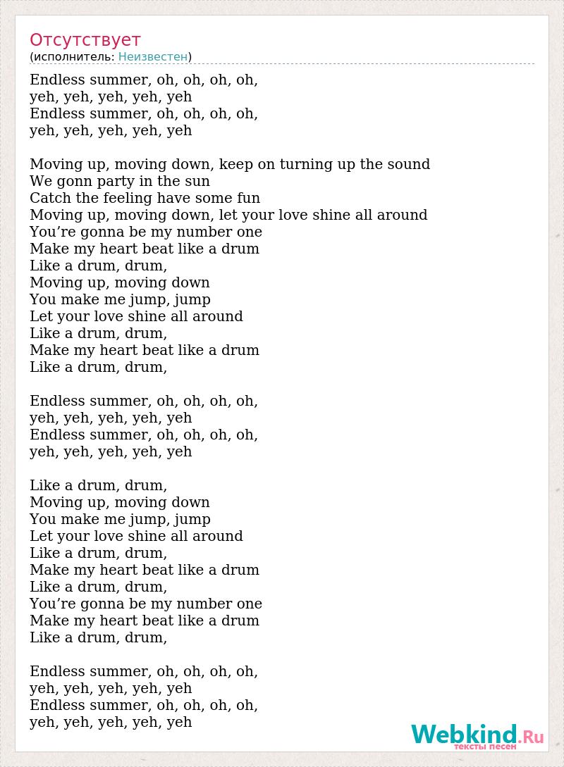 Endless summer, oh, oh, oh, oh, yeh, yeh, yeh, yeh, yeh Endless summer, oh, oh, oh, oh, yeh, yeh, yeh, yeh, yeh Moving up, moving down, keep on turning up the sound We gonn party in the sun Catch the feeling have some fun Moving up, moving down, let your love shine all around You’re gonna be my number one Make my heart beat like a [bad word] Like a [bad word] [bad word] Moving up, moving down You make me jump, jump Let your love shine all around Like a [bad word] [bad word] Make my heart beat like a [bad word] Like a [bad word] [bad word] Endless summer, oh, oh, oh, oh, yeh, yeh, yeh, yeh, yeh Endless summer, oh, oh, oh, oh, yeh, yeh, yeh, yeh, yeh Like a [bad word] [bad word] Moving up, moving down You make me jump, jump Let your love shine all around Like a [bad word] [bad word] Make my heart beat like a [bad word] Like a [bad word] [bad word] You’re gonna be my number one Make my heart beat like a [bad word] Like a [bad word] [bad word] Endless summer, oh, oh, oh, oh, yeh, yeh, yeh, yeh, yeh Endless summer, oh, oh, oh, oh, yeh, yeh, yeh, yeh, yeh