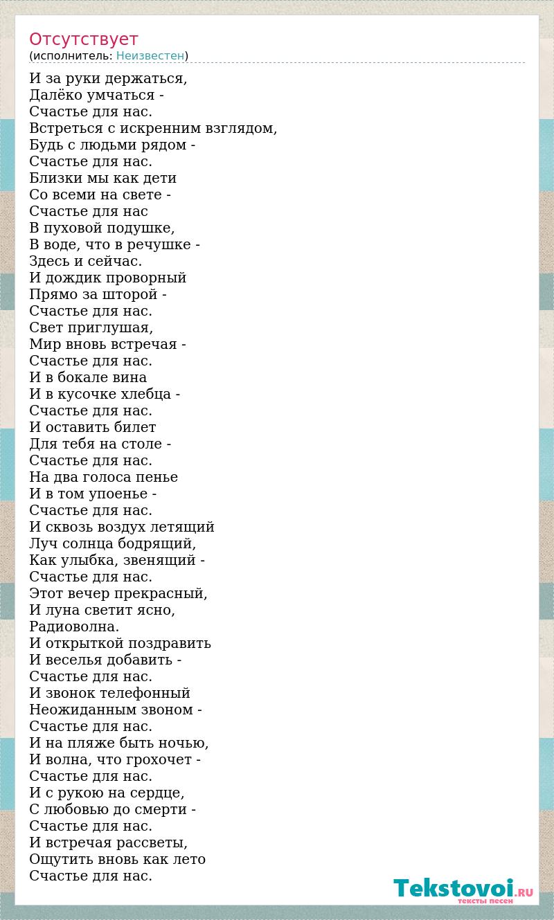 И за руки держаться, Далёко умчаться - Счастье для нас. Встреться с искренним взглядом, Будь с людьми рядом - Счастье для нас. Близки мы как дети Со всеми на свете - Счастье для нас В пуховой подушке, В воде, что в речушке - Здесь и сейчас. И дождик проворный Прямо за шторой - Счастье для нас. Свет приглушая, Мир вновь встречая - Счастье для нас. И в бокале вина И в кусочке хлебца - Счастье для нас. И оставить билет Для тебя на столе - Счастье для нас. На два голоса пенье И в том упоенье - Счастье для нас. И сквозь воздух летящий Луч солнца бодрящий, Как улыбка, звенящий - Счастье для нас. Этот вечер прекрасный, И луна светит ясно, Радиоволна. И открыткой поздравить И веселья добавить - Счастье для нас. И звонок телефонный Неожиданным звоном - Счастье для нас. И на пляже быть ночью, И волна, что грохочет - Счастье для нас. И с рукою на сердце, С любовью до смерти - Счастье для нас. И встречая рассветы, Ощутить вновь как лето Счастье для нас.