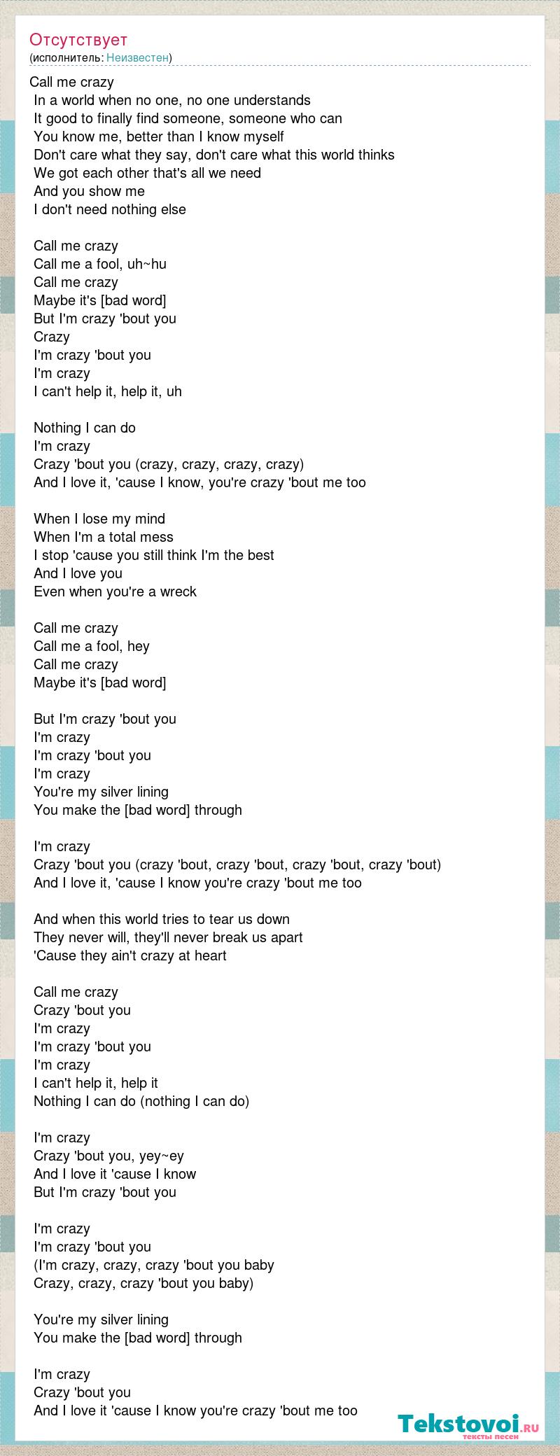 Call me crazy In a world when no one, no one understands It good to finally find someone, someone who can You know me, better than I know myself Don't care what they say, don't care what this world thinks We got each other that's all we need And you show me I don't need nothing else Call me crazy Call me a fool, uh~hu Call me crazy Maybe it's [bad word] But I'm crazy 'bout you Crazy I'm crazy 'bout you I'm crazy I can't help it, help it, uh Nothing I can do I'm crazy Crazy 'bout you (crazy, crazy, crazy, crazy) And I love it, 'cause I know, you're crazy 'bout me too When I lose my mind When I'm a total mess I stop 'cause you still think I'm the best And I love you Even when you're a wreck Call me crazy Call me a fool, hey Call me crazy Maybe it's [bad word] But I'm crazy 'bout you I'm crazy I'm crazy 'bout you I'm crazy You're my silver lining You make the [bad word] through I'm crazy Crazy 'bout you (crazy 'bout, crazy 'bout, crazy 'bout, crazy 'bout) And I love it, 'cause I know you're crazy 'bout me too And when this world tries to tear us down They never will, they'll never break us apart 'Cause they ain't crazy at heart Call me crazy Crazy 'bout you I'm crazy I'm crazy 'bout you I'm crazy I can't help it, help it Nothing I can do (nothing I can do) I'm crazy Crazy 'bout you, yey~ey And I love it 'cause I know But I'm crazy 'bout you I'm crazy I'm crazy 'bout you (I'm crazy, crazy, crazy 'bout you baby Crazy, crazy, crazy 'bout you baby) You're my silver lining You make the [bad word] through I'm crazy Crazy 'bout you And I love it 'cause I know you're crazy 'bout me too