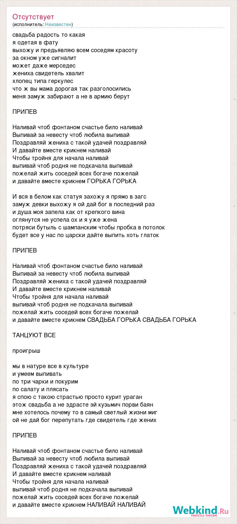 свадьба радость то какая я одетая в фату выхожу и предьявляю всем соседям красоту за окном уже сигналит может даже мерседес жениха свидетель хвалит хлопец типа геркулес что ж вы мама дорогая так разголосились меня замуж забирают а не в армию берут ПРИПЕВ Наливай чтоб фонтаном счастье било наливай Выпивай за невесту чтоб любила выпивай Поздравляй жениха с такой удачей поздравляй И давайте вместе крикнем наливай Чтобы тройня для начала наливай выпивай чтоб родня не подкачала выпивай пожелай жить соседей всех богаче пожелай и давайте вместе крикнем ГОРЬКА ГОРЬКА И вся в белом как статуя захожу я прямо в загс замуж девки выхожу я ой дай бог в последний раз и душа моя запела как от крепкого вина оглянутся не успела ох и я уже жена потряси бутыль с шампанским чтобы пробка в потолок будет все у нас по царски дайте выпить хоть глаток ПРИПЕВ Наливай чтоб фонтаном счастье било наливай Выпивай за невесту чтоб любила выпивай Поздравляй жениха с такой удачей поздравляй И давайте вместе крикнем наливай Чтобы тройня для начала наливай выпивай чтоб родня не подкачала выпивай пожелай жить соседей всех богаче пожелай и давайте вместе крикнем СВАДЬБА ГОРЬКА СВАДЬБА ГОРЬКА ТАНЦУЮТ ВСЕ проигрыш мы в натуре все в культуре и умеем выпивать по три чарки и покурим по салату и плясать я спою с такою страстью просто курит ураган этож свадьба а не здрасте эй кузьмич порви баян мне хотелось почему то в самый светлый жизни миг ой не дай бог перепутать где свидетель где жених ПРИПЕВ Наливай чтоб фонтаном счастье било наливай Выпивай за невесту чтоб любила выпивай Поздравляй жениха с такой удачей поздравляй И давайте вместе крикнем наливай Чтобы тройня для начала наливай выпивай чтоб родня не подкачала выпивай пожелай жить соседей всех богаче пожелай и давайте вместе крикнем НАЛИВАЙ НАЛИВАЙ