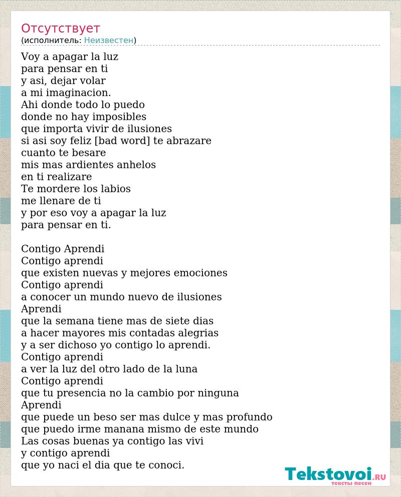 Voy a apagar la luz para pensar en ti y asi, dejar volar a mi imaginacion. Ahi donde todo lo puedo donde no hay imposibles que importa vivir de ilusiones si asi soy feliz [bad word] te abrazare cuanto te besare mis mas ardientes anhelos en ti realizare Te mordere los labios me llenare de ti y por eso voy a apagar la luz para pensar en ti. Contigo Aprendi Contigo aprendi que existen nuevas y mejores emociones Contigo aprendi a conocer un mundo nuevo de ilusiones Aprendi que la semana tiene mas de siete dias a hacer mayores mis contadas alegrias y a ser dichoso yo contigo lo aprendi. Contigo aprendi a ver la luz del otro lado de la luna Contigo aprendi que tu presencia no la cambio por ninguna Aprendi que puede un beso ser mas dulce y mas profundo que puedo irme manana mismo de este mundo Las cosas buenas ya contigo las vivi y contigo aprendi que yo naci el dia que te conoci.