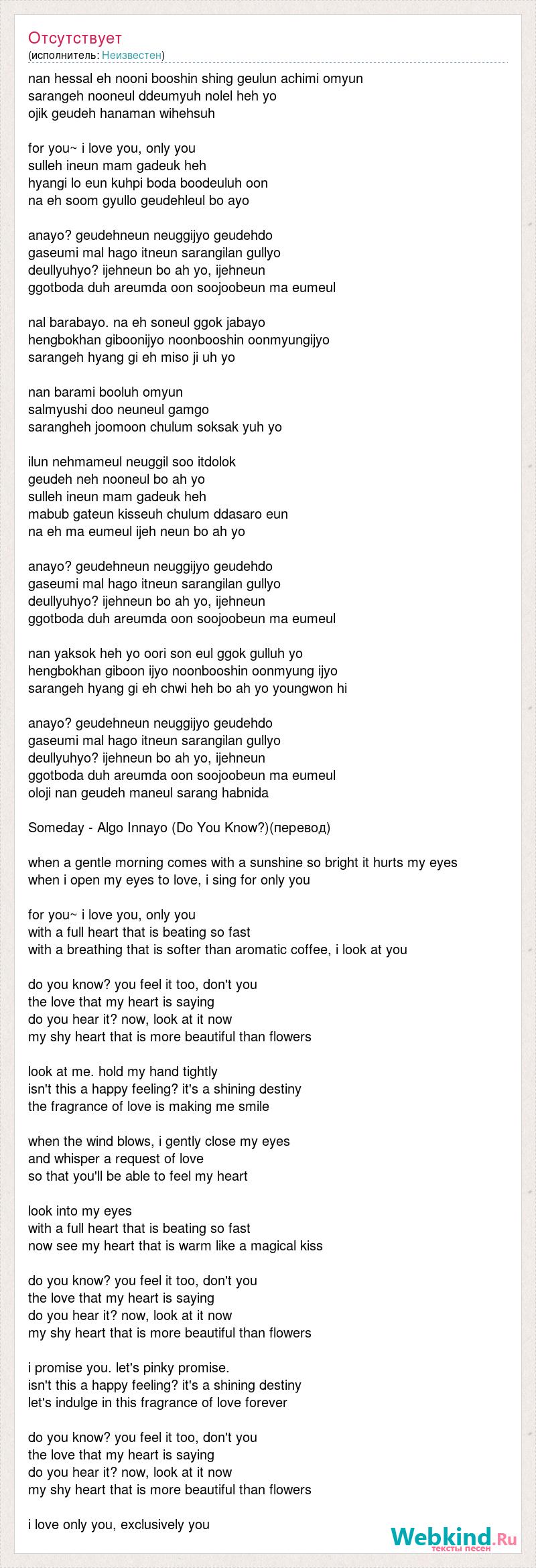 nan hessal eh nooni booshin shing geulun achimi omyun sarangeh nooneul ddeumyuh nolel heh yo ojik geudeh hanaman wihehsuh for you~ i love you, only you sulleh ineun mam gadeuk heh hyangi lo eun kuhpi boda boodeuluh oon na eh soom gyullo geudehleul bo ayo anayo? geudehneun neuggijyo geudehdo gaseumi mal hago itneun sarangilan gullyo deullyuhyo? ijehneun bo ah yo, ijehneun ggotboda duh areumda oon soojoobeun ma eumeul nal barabayo. na eh soneul ggok jabayo hengbokhan giboonijyo noonbooshin oonmyungijyo sarangeh hyang gi eh miso ji uh yo nan barami booluh omyun salmyushi doo neuneul gamgo sarangheh joomoon chulum soksak yuh yo ilun nehmameul neuggil soo itdolok geudeh neh nooneul bo ah yo sulleh ineun mam gadeuk heh mabub gateun kisseuh chulum ddasaro eun na eh ma eumeul ijeh neun bo ah yo anayo? geudehneun neuggijyo geudehdo gaseumi mal hago itneun sarangilan gullyo deullyuhyo? ijehneun bo ah yo, ijehneun ggotboda duh areumda oon soojoobeun ma eumeul nan yaksok heh yo oori son eul ggok gulluh yo hengbokhan giboon ijyo noonbooshin oonmyung ijyo sarangeh hyang gi eh chwi heh bo ah yo youngwon hi anayo? geudehneun neuggijyo geudehdo gaseumi mal hago itneun sarangilan gullyo deullyuhyo? ijehneun bo ah yo, ijehneun ggotboda duh areumda oon soojoobeun ma eumeul oloji nan geudeh maneul sarang habnida Someday - Algo Innayo (Do You Know?)(перевод) when a gentle [bad word] with a sunshine so bright it hurts my eyes when i open my eyes to love, i sing for only you for you~ i love you, only you with a full heart that is beating so fast with a breathing that is softer than aromatic coffee, i look at you do you know? you feel it too, don't you the love that my heart is saying do you hear it? now, look at it now my shy heart that is more beautiful than flowers look at me. hold my hand tightly isn't this a happy feeling? it's a shining destiny the fragrance of love is making me smile when the wind blows, i gently close my eyes and whisper a request of love so that you'll be able to feel my heart look into my eyes with a full heart that is beating so fast now see my heart that is warm like a magical kiss do you know? you feel it too, don't you the love that my heart is saying do you hear it? now, look at it now my shy heart that is more beautiful than flowers i promise you. let's pinky promise. isn't this a happy feeling? it's a shining destiny let's indulge in this fragrance of love forever do you know? you feel it too, don't you the love that my heart is saying do you hear it? now, look at it now my shy heart that is more beautiful than flowers i love only you, exclusively you