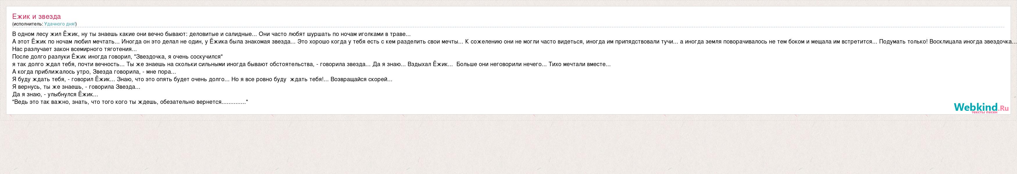В одном лесу жил Ёжик, ну ты знаешь какие они вечно бывают: деловитые и салидные... Они часто любят шуршать по ночам иголками в траве... А этот Ёжик по ночам любил мечтать... Иногда он это делал не один, у Ёжика была знакомая звезда... Это хорошо когда у тебя есть с кем разделить свои мечты... К сожелению они не могли часто видеться, иногда им припядствовали тучи... а иногда земля поворачивалось не тем боком и мещала им встретится... Подумать только! Восклицала иногда звездочка... Нас разлучает закон всемирного тяготения... После долго разлуки Ёжик иногда говорил, "Звездочка, я очень соскучился" я так долго ждал тебя, почти вечность... Ты же знаешь на скольки сильными иногда бывают обстоятельства, - говорила звезда... Да я знаю... Вздыхал Ёжик... Больше они неговорили нечего... Тихо мечтали вместе... А когда приближалось утро, Звезда говорила, - мне пора... Я буду ждать тебя, - говорил Ёжик... Знаю, что это опять будет очень долго... Но я все ровно буду ждать тебя!... Возвращайся скорей... Я вернусь, ты же знаешь, - говорила Звезда... Да я знаю, - улыбнулся Ёжик... "Ведь это так важно, знать, что того кого ты ждешь, обезательно вернется.............."