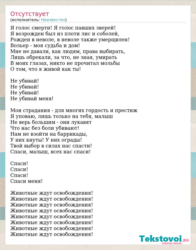 Я голос смерти! Я голос павших зверей! Я возрожден был из плоти лис и соболей, Рожден в неволе, в неволе также умерщвлен! Вольер - моя судьба и дом! Мне не давали, как людям, права выбирать, Лишь обрекали, за что, не зная, умирать В моих глазах, никто не прочитал мольбы О том, что я живой как ты! Не убивай! Не убивай! Не убивай! Не убивай меня! Мои страдания - для многих гордость и престиж Я уповаю, лишь только на тебя, малыш Не верь большим - они лукавят Что нас без боли убивают! Нам не взойти на баррикады, У них кнуты! У них ограды! Твой выбор в силах нас спасти! Спаси, малыш, всех нас спаси! Спаси! Спаси! Спаси! Спаси меня! Животные ждут освобождения! Животные ждут освобождения! Животные ждут освобождения! Животные ждут освобождения! Животные ждут освобождения! Животные ждут освобождения! Животные ждут освобождения! Животные ждут освобождения!