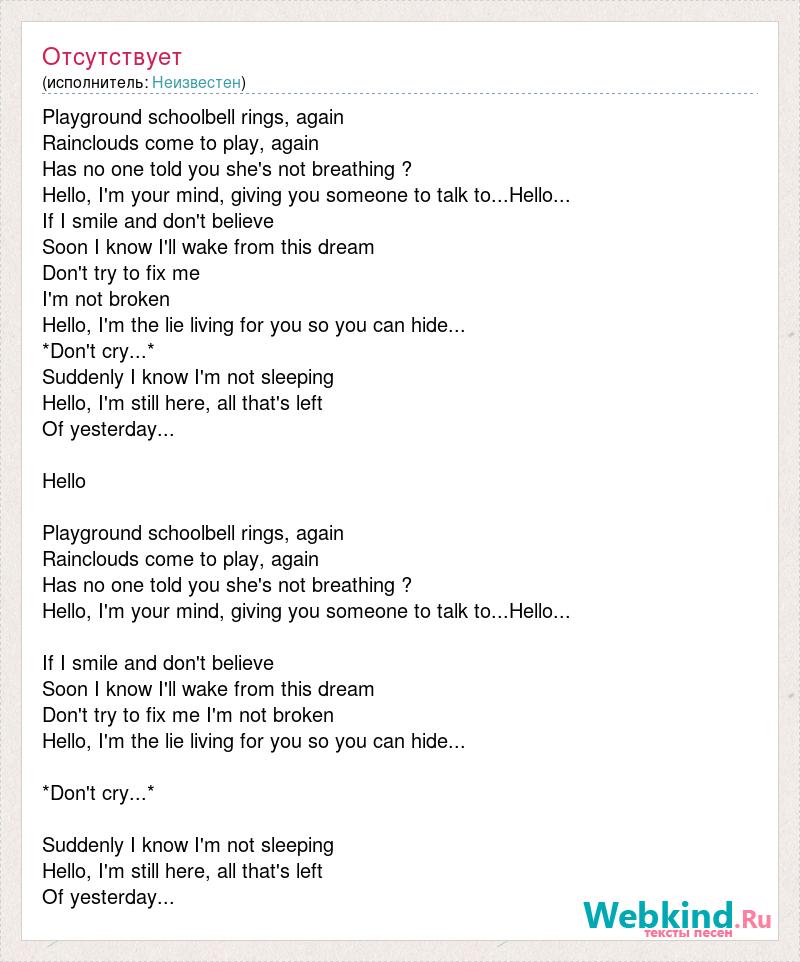 Playground schoolbell rings, again [bad word] to play, again Has no one told you she's not breathing ? Hello, I'm your mind, giving you someone to talk to...Hello... If I smile and don't believe Soon I know I'll wake from this dream Don't try to fix me I'm not broken Hello, I'm the lie living for you so you can hide... *Don't cry...* Suddenly I know I'm not sleeping Hello, I'm still here, all that's left Of yesterday... Hello Playground schoolbell rings, again [bad word] to play, again Has no one told you she's not breathing ? Hello, I'm your mind, giving you someone to talk to...Hello... If I smile and don't believe Soon I know I'll wake from this dream Don't try to fix me I'm not broken Hello, I'm the lie living for you so you can hide... *Don't cry...* Suddenly I know I'm not sleeping Hello, I'm still here, all that's left Of yesterday...