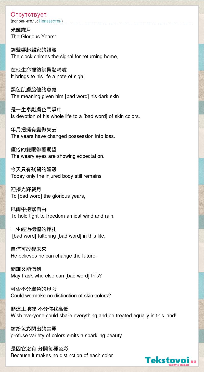光輝歲月 The Glorious Years: 鐘聲響起歸家的訊號 The clock chimes the signal for returning home, 在他生命裡彷彿帶點唏噓 It brings to his life a note of sigh! 黑色肌膚給他的意義 The meaning given him [bad word] his dark skin 是一生奉獻膚色鬥爭中 Is devotion of his whole life to a [bad word] of skin colors. 年月把擁有變做失去 The years have changed possession into loss. 疲倦的雙眼帶著期望 The weary eyes are showing expectation. 今天只有殘留的軀殼 Today only the injured body still remains 迎接光輝歲月 To [bad word] the glorious years, 風雨中抱緊自由 To hold tight to freedom amidst wind and rain. 一生經過徬惶的掙扎 [bad word] faltering [bad word] in this life, 自信可改變未來 He believes he can change the future. 問誰又能做到 May I ask who else can [bad word] this? 可否不分膚色的界限 Could we make no distinction of skin colors? 願這土地裡 不分你我高低 Wish everyone could share everything and be treated equally in this land! 繽紛色彩閃出的美麗 profuse variety of colors emits a sparkling beauty 是因它沒有 分開每種色彩 Because it makes no distinction of each color.