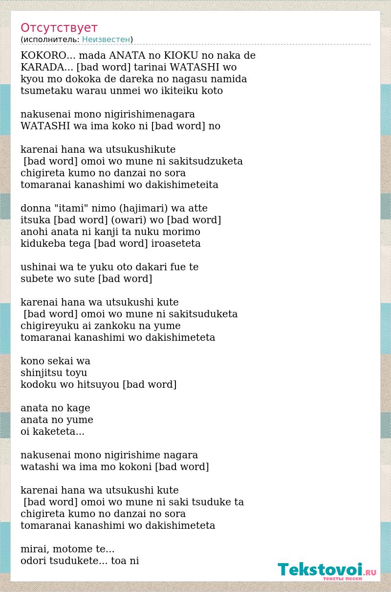 KOKORO... mada ANATA no KIOKU no naka de KARADA... [bad word] tarinai WATASHI wo kyou mo dokoka de dareka no nagasu namida tsumetaku warau unmei wo ikiteiku koto nakusenai mono nigirishimenagara WATASHI wa ima koko ni [bad word] no karenai hana wa utsukushikute [bad word] omoi wo mune ni sakitsudzuketa chigireta kumo no danzai no sora tomaranai kanashimi wo dakishimeteita donna "itami" nimo (hajimari) wa atte itsuka [bad word] (owari) wo [bad word] anohi anata ni kanji ta nuku morimo kidukeba tega [bad word] iroaseteta ushinai wa te yuku oto dakari fue te subete wo sute [bad word] karenai hana wa utsukushi kute [bad word] omoi wo mune ni sakitsuduketa chigireyuku ai zankoku na yume tomaranai kanashimi wo dakishimeteta kono sekai wa shinjitsu toyu kodoku wo hitsuyou [bad word] anata no kage anata no yume oi kaketeta... nakusenai mono nigirishime nagara watashi wa ima mo kokoni [bad word] karenai hana wa utsukushi kute [bad word] omoi wo mune ni saki tsuduke ta chigireta kumo no danzai no sora tomaranai kanashimi wo dakishimeteta mirai, motome te... odori tsudukete... toa ni