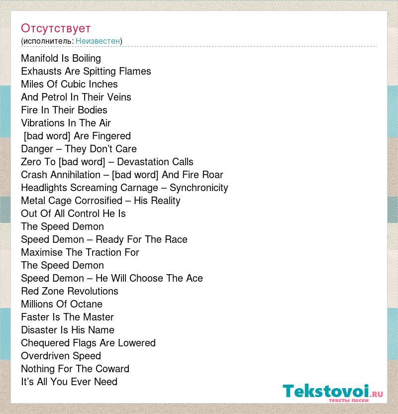 Manifold Is Boiling Exhausts Are Spitting Flames Miles Of Cubic Inches And Petrol In Their Veins Fire In Their Bodies Vibrations In The Air [bad word] Are Fingered Danger – They Don’t Care Zero To [bad word] – Devastation Calls Crash Annihilation – [bad word] And Fire Roar Headlights Screaming Carnage – Synchronicity Metal Cage Corrosified – His Reality Out Of All Control He Is The Speed Demon Speed Demon – Ready For The Race Maximise The Traction For The Speed Demon Speed Demon – He Will Choose The Ace Red Zone Revolutions Millions Of Octane Faster Is The Master Disaster Is His Name Chequered Flags Are Lowered Overdriven Speed Nothing For The Coward It’s All You Ever Need