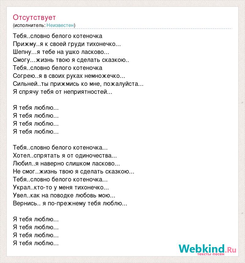Тебя..словно белого котеночка Прижму..я к своей груди тихонечко... Шепну...я тебе на ушко ласково... Смогу...жизнь твою я сделать сказкою.. Тебя..словно белого котеночка Согрею..я в своих руках немножечко... Сильней..ты прижмись ко мне, пожалуйста... Я спрячу тебя от неприятностей... Я тебя люблю... Я тебя люблю... Я тебя люблю... Я тебя люблю... Тебя..словно белого котеночка... Хотел..спрятать я от одиночества... Любил..я наверно слишком ласково... Не смог..жизнь твою я сделать сказкою... Тебя..словно белого котеночка... Украл..кто-то у меня тихонечко... Увел..как на поводке любовь мою... Вернись.. я по-прежнему тебя люблю... Я тебя люблю... Я тебя люблю... Я тебя люблю... Я тебя люблю...