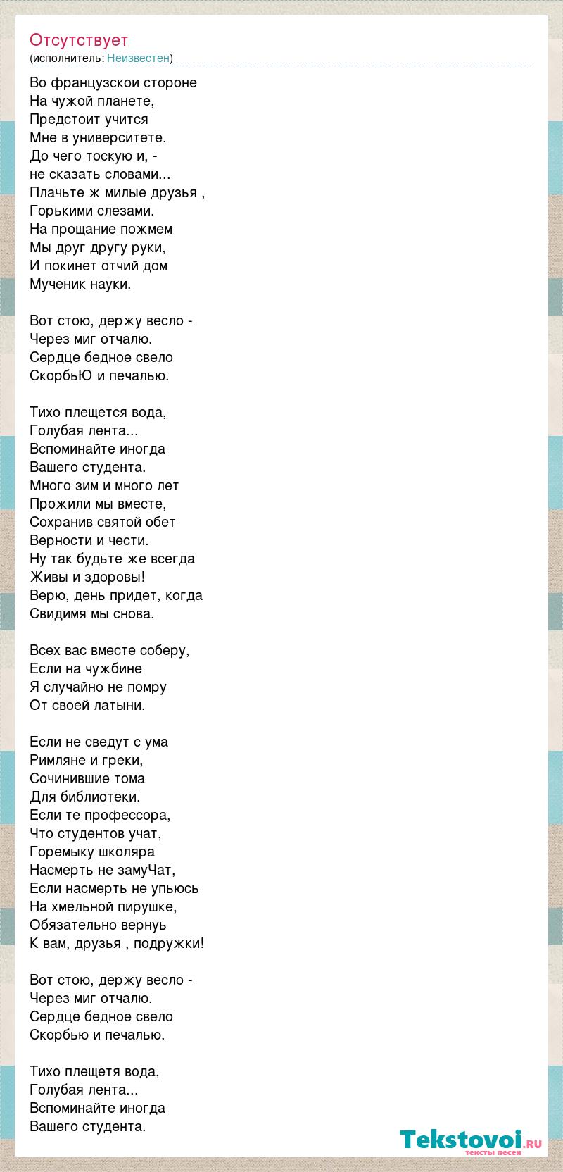 Во французскои стороне На чужой планете, Предстоит учится Мне в университете. До чего тоскую и, - не сказать словами... Плачьте ж милые друзья , Горькими слезами. На прощание пожмем Мы друг другу руки, И покинет отчий дом Мученик науки. Вот стою, держу весло - Через миг отчалю. Сердце бедное свело СкорбьЮ и печалью. Тихо плещется вода, Голубая лента... Вспоминайте иногда Вашего студента. Много зим и много лет Прожили мы вместе, Сохранив святой обет Верности и чести. Ну так будьте же всегда Живы и здоровы! Верю, день придет, когда Свидимя мы снова. Всех вас вместе соберу, Если на чужбине Я случайно не помру От своей латыни. Если не сведут с ума Римляне и греки, Сочинившие тома Для библиотеки. Если те профессора, Что студентов учат, Горемыку школяра Насмерть не замуЧат, Если насмерть не упьюсь На хмельной пирушке, Обязательно вернуь К вам, друзья , подружки! Вот стою, держу весло - Через миг отчалю. Сердце бедное свело Скорбью и печалью. Тихо плещетя вода, Голубая лента... Вспоминайте иногда Вашего студента.