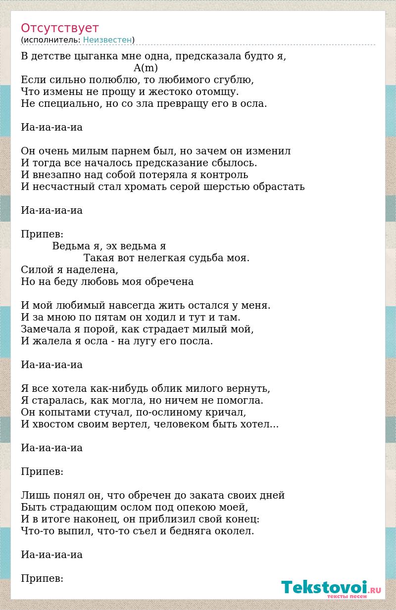В детстве цыганка мне одна, предсказала будто я, A(m) Если сильно полюблю, то любимого сгублю, Что измены не прощу и жестоко отомщу. Не специально, но со зла превращу его в осла. Иа-иа-иа-иа Он очень милым парнем был, но зачем он изменил И тогда все началось предсказание сбылось. И внезапно над собой потеряла я контроль И несчастный стал хромать серой шерстью обрастать Иа-иа-иа-иа Припев: Ведьма я, эх ведьма я Такая вот нелегкая судьба моя. Силой я наделена, Но на беду любовь моя обречена И мой любимый навсегда жить остался у меня. И за мною по пятам он ходил и тут и там. Замечала я порой, как страдает милый мой, И жалела я осла - на лугу его посла. Иа-иа-иа-иа Я все хотела как-нибудь облик милого вернуть, Я старалась, как могла, но ничем не помогла. Он копытами стучал, по-ослиному кричал, И хвостом своим вертел, человеком быть хотел... Иа-иа-иа-иа Припев: Лишь понял он, что обречен до заката своих дней Быть страдающим ослом под опекою моей, И в итоге наконец, он приблизил свой конец: Что-то выпил, что-то съел и бедняга околел. Иа-иа-иа-иа Припев: