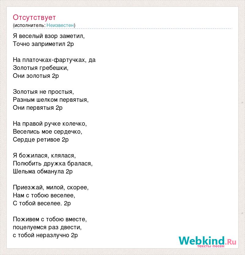 Я веселый взор заметил, Точно заприметил 2р На платочках-фартучках, да Золотыя гребешки, Они золотыя 2р Золотыя не простыя, Разным шелком первятыя, Они первятыя 2р На правой ручке колечко, Веселись мое сердечко, Сердце ретивое 2р Я божилася, клялася, Полюбить дружка бралася, Шельма обманула 2р Приезжай, милой, скорее, Нам с тобою веселее, С тобой веселее. 2р Поживем с тобою вместе, поцелуемся раз двести, с тобой неразлучно 2р
