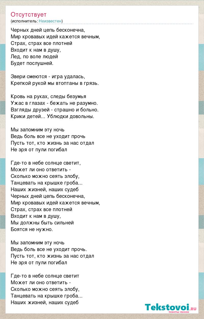 Черных дней цепь бесконечна, Мир кровавых идей кажется вечным, Страх, страх все плотней Входит к нам в душу, Лед, по воле людей Будет послушней. Звери смеются - игра удалась, Крепкой рукой мы втоптаны в грязь. Кровь на руках, следы безумья Ужас в глазах - бежать не разумно. Взгляды друзей - страшно и больно. Крики детей... Ублюдки довольны. Мы запомним эту ночь Ведь боль все не уходит прочь Пусть тот, кто жизнь за нас отдал Не зря от пули погибал Где-то в небе солнце светит, Может ли оно ответить - Сколько можно сеять злобу, Танцевать на крышке гроба... Наших жизней, наших судеб Черных дней цепь бесконечна, Мир кровавых идей кажется вечным, Страх, страх все плотней Входит к нам в душу, Мы должны быть сильней Боятся не нужно. Мы запомним эту ночь Ведь боль все не уходит прочь. Пусть тот, кто жизнь за нас отдал Не зря от пули погибал Где-то в небе солнце светит Может ли оно ответить - Сколько можно сеять злобу, Танцевать на крышке гроба... Наших жизней, наших судеб