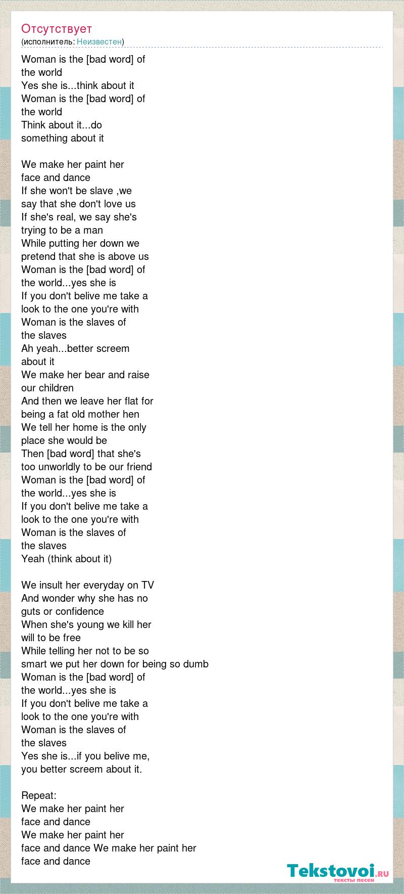 Woman is the [bad word] of the world Yes she is...think about it Woman is the [bad word] of the world Think about it...do something about it We make her paint her face and dance If she won't be slave ,we say that she don't love us If she's real, we say she's trying to be a man While putting her down we pretend that she is above us Woman is the [bad word] of the world...yes she is If you don't belive me take a look to the one you're with Woman is the slaves of the slaves Ah yeah...better screem about it We make her bear and raise our children And then we leave her flat for being a fat old mother hen We tell her home is the only place she would be Then [bad word] that she's too unworldly to be our friend Woman is the [bad word] of the world...yes she is If you don't belive me take a look to the one you're with Woman is the slaves of the slaves Yeah (think about it) We insult her everyday on TV And wonder why she has no guts or confidence When she's young we kill her will to be free While telling her not to be so smart we put her down for being so dumb Woman is the [bad word] of the world...yes she is If you don't belive me take a look to the one you're with Woman is the slaves of the slaves Yes she is...if you belive me, you better screem about it. Repeat: We make her paint her face and dance We make her paint her face and dance We make her paint her face and dance