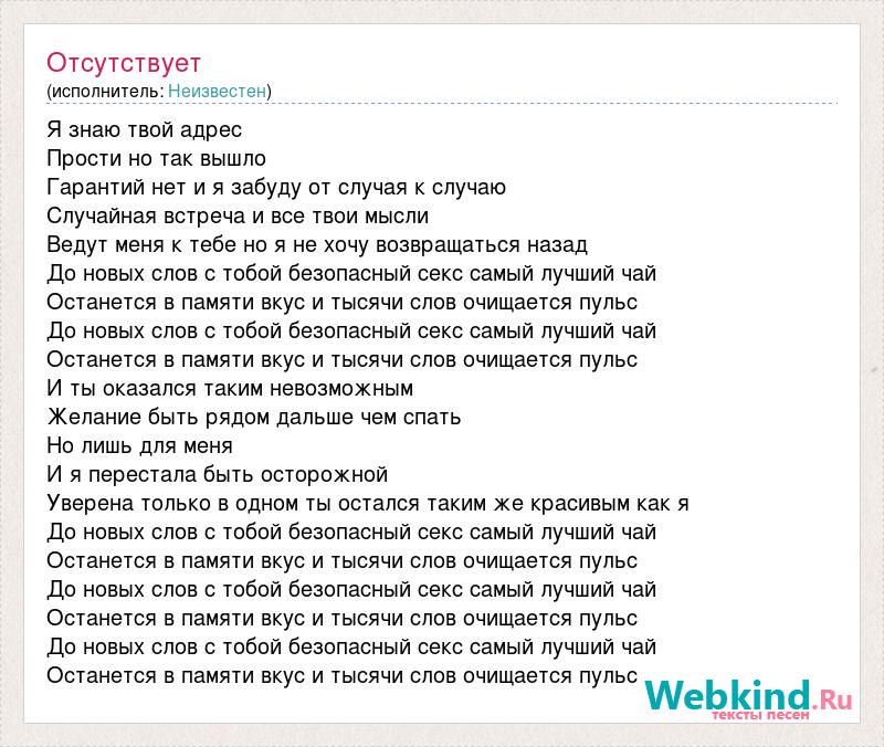 Я знаю твой адрес Прости но так вышло Гарантий нет и я забуду от случая к случаю Случайная встреча и все твои мысли Ведут меня к тебе но я не хочу возвращаться назад До новых слов с тобой безопасный секс самый лучший чай Останется в памяти вкус и тысячи слов очищается пульс До новых слов с тобой безопасный секс самый лучший чай Останется в памяти вкус и тысячи слов очищается пульс И ты оказался таким невозможным Желание быть рядом дальше чем спать Но лишь для меня И я перестала быть осторожной Уверена только в одном ты остался таким же красивым как я До новых слов с тобой безопасный секс самый лучший чай Останется в памяти вкус и тысячи слов очищается пульс До новых слов с тобой безопасный секс самый лучший чай Останется в памяти вкус и тысячи слов очищается пульс До новых слов с тобой безопасный секс самый лучший чай Останется в памяти вкус и тысячи слов очищается пульс