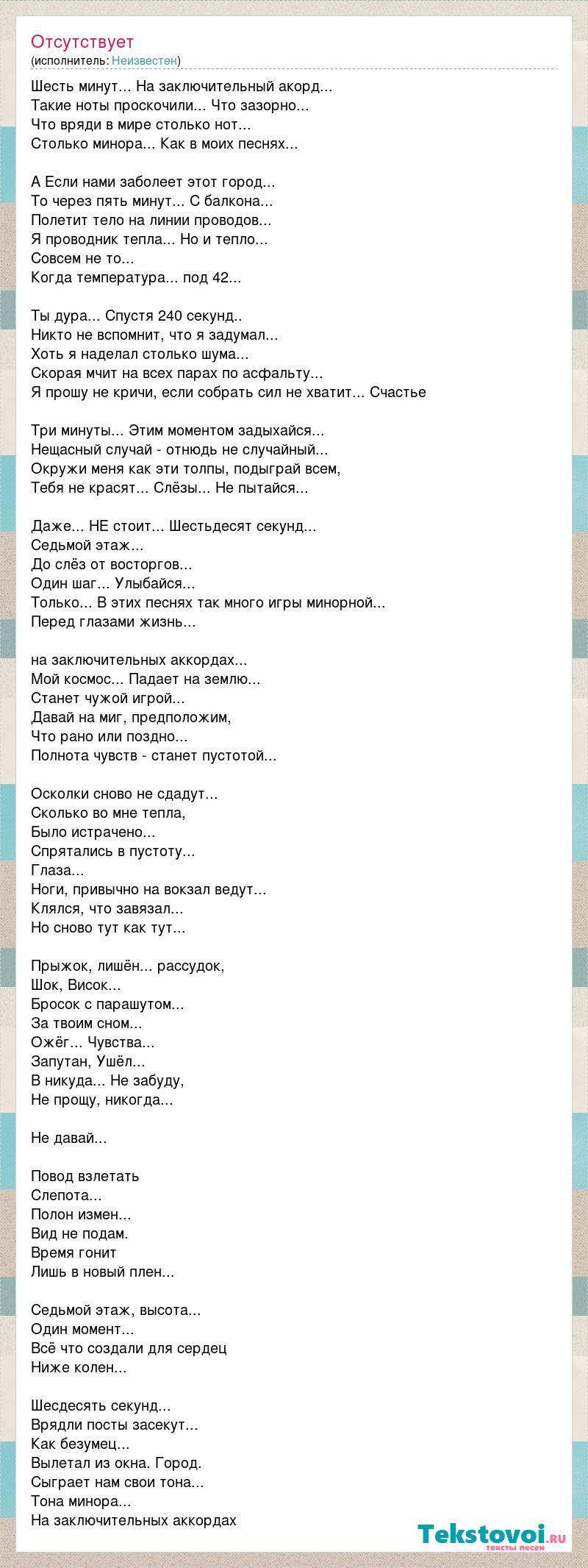 Шесть минут... На заключительный акорд... Такие ноты проскочили... Что зазорно... Что вряди в мире столько нот... Столько минора... Как в моих песнях... А Если нами заболеет этот город... То через пять минут... С балкона... Полетит тело на линии проводов... Я проводник тепла... Но и тепло... Совсем не то... Когда температура... под 42... Ты дура... Спустя 240 секунд.. Никто не вспомнит, что я задумал... Хоть я наделал столько шума... Скорая мчит на всех парах по асфальту... Я прошу не кричи, если собрать сил не хватит... Счастье Три минуты... Этим моментом задыхайся... Нещасный случай - отнюдь не случайный... Окружи меня как эти толпы, подыграй всем, Тебя не красят... Слёзы... Не пытайся... Даже... НЕ стоит... Шестьдесят секунд... Седьмой этаж... До слёз от восторгов... Один шаг... Улыбайся... Только... В этих песнях так много игры минорной... Перед глазами жизнь... на заключительных аккордах... Мой космос... Падает на землю... Станет чужой игрой... Давай на миг, предположим, Что рано или поздно... Полнота чувств - станет пустотой... Осколки сново не сдадут... Сколько во мне тепла, Было истрачено... Спрятались в пустоту... Глаза... Ноги, привычно на вокзал ведут... Клялся, что завязал... Но сново тут как тут... Прыжок, лишён... рассудок, Шок, Висок... Бросок с парашутом... За твоим сном... Ожёг... Чувства... Запутан, Ушёл... В никуда... Не забуду, Не прощу, никогда... Не давай... Повод взлетать Слепота... Полон измен... Вид не подам. Время гонит Лишь в новый плен... Седьмой этаж, высота... Один момент... Всё что создали для сердец Ниже колен... Шесдесять секунд... Врядли посты засекут... Как безумец... Вылетал из окна. Город. Сыграет нам свои тона... Тона минора... На заключительных аккордах