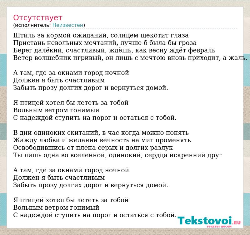 Штиль за кормой ожиданий, солнцем щекотит глаза Пристань невольных мечтаний, лучше б была бы гроза Берег далёкий, счастливый, ждёшь, как весну ждёт февраль Ветер волшебник игривый, он лишь с мечтою вновь приходит, а жаль. А там, где за окнами город ночной Должен я быть счастливым Забыть прозу долгих дорог и вернуться домой. Я птицей хотел бы лететь за тобой Вольным ветром гонимый С надеждой ступить на порог и остаться с тобой. В дни одиноких скитаний, в час когда можно понять Жажду любви и желаний вечность на миг променять Освободившись от плена серых и долгих разлук Ты лишь одна во вселенной, одинокий, сердца искренний друг А там, где за окнами город ночной Должен я быть счастливым Забыть прозу долгих дорог и вернуться домой. Я птицей хотел бы лететь за тобой Вольным ветром гонимый С надеждой ступить на порог и остаться с тобой.