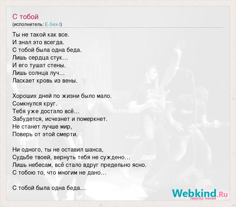 Ты не такой как все. И знал это всегда. С тобой была одна беда. Лишь сердца стук… И его тушат стены. Лишь солнца луч… Ласкает кровь из вены. Хороших дней по жизни было мало. Сомкнулся круг. Тебя уже достало всё… Забудется, исчезнет и померкнет. Не станет лучше мир, Поверь от этой смерти. Ни одного, ты не оставил шанса, Судьбе твоей, вернуть тебя не суждено… Лишь небесам, всё стало вдруг предельно ясно. С тобою то, что многим не дано… С тобой была одна беда…
