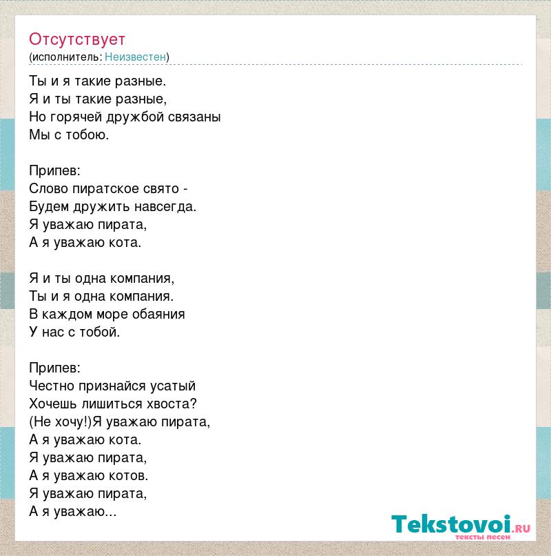 Ты и я такие разные. Я и ты такие разные, Но горячей дружбой связаны Мы с тобою. Припев: Слово пиратское свято - Будем дружить навсегда. Я уважаю пирата, А я уважаю кота. Я и ты одна компания, Ты и я одна компания. В каждом море обаяния У нас с тобой. Припев: Честно признайся усатый Хочешь лишиться хвоста? (Не хочу!)Я уважаю пирата, А я уважаю кота. Я уважаю пирата, А я уважаю котов. Я уважаю пирата, А я уважаю...