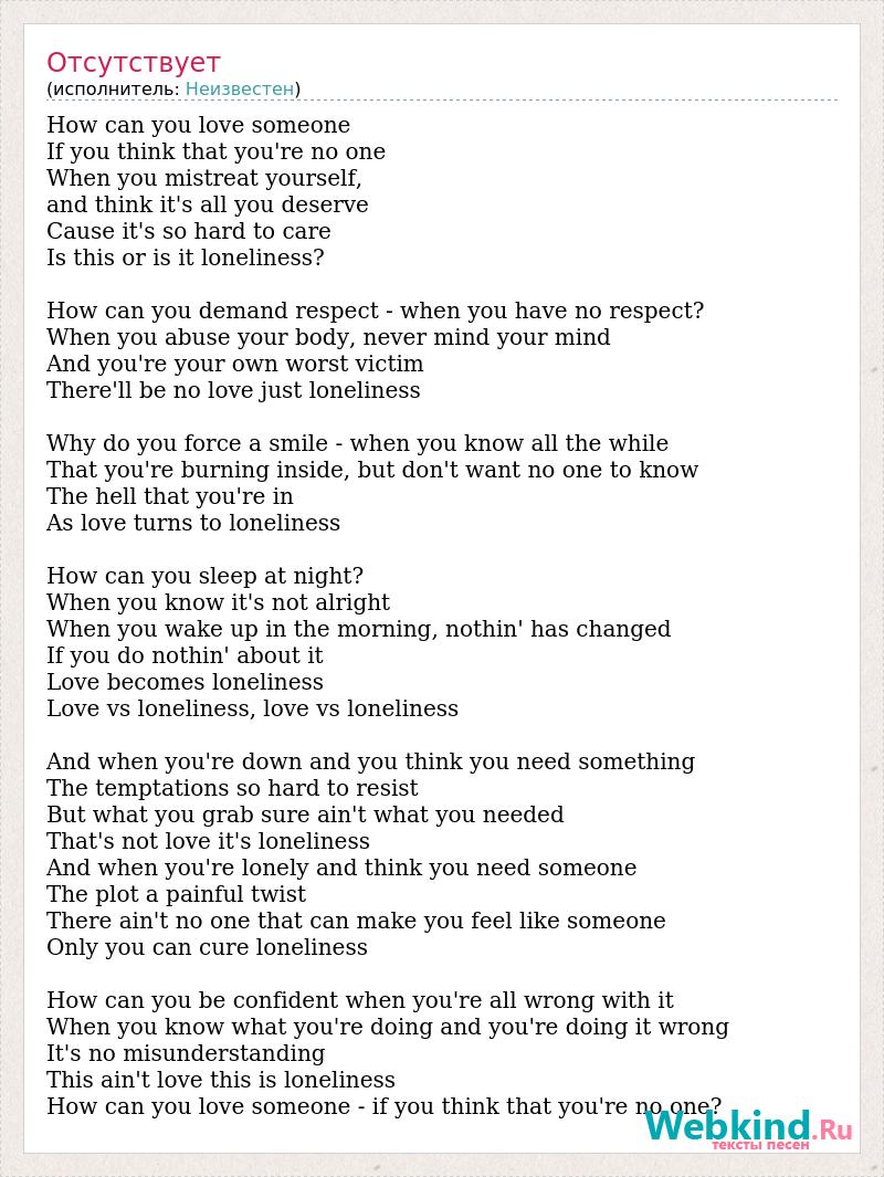 How can you love someone If you think that you're no one When you mistreat yourself, and think it's all you deserve Cause it's so hard to care Is this or is it loneliness? How can you demand respect - when you have no respect? When you abuse your body, never mind your mind And you're your own worst victim There'll be no love just loneliness Why do you force a smile - when you know all the while That you're burning inside, but don't want no one to know The [bad word] that you're in As love turns to loneliness How can you sleep at night? When you know it's not alright When you wake up in the morning, nothin' has changed If you do nothin' about it Love [bad word] loneliness Love vs loneliness, love vs loneliness And when you're down and you think you need something The temptations so hard to resist But what you grab sure ain't what you needed That's not love it's loneliness And when you're lonely and think you need someone The plot a painful twist There ain't no one that can make you feel like someone Only you can cure loneliness How can you be confident when you're all wrong with it When you know what you're doing and you're doing it wrong It's no misunderstanding This ain't love this is loneliness How can you love someone - if you think that you're no one?