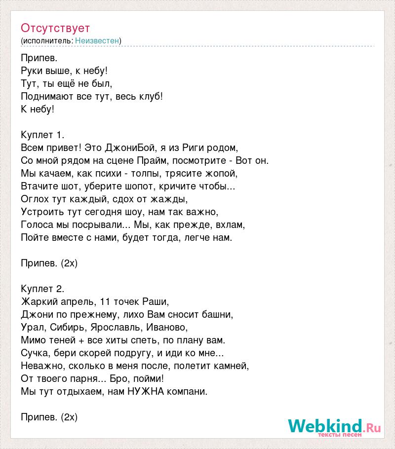 Припев. Руки выше, к небу! Тут, ты ещё не был, Поднимают все тут, весь клуб! К небу! Куплет 1. Всем привет! Это ДжониБой, я из Риги родом, Со мной рядом на сцене Прайм, посмотрите - Вот он. Мы качаем, как психи - толпы, трясите жопой, Втачите шот, уберите шопот, кричите чтобы... Оглох тут каждый, сдох от жажды, Устроить тут сегодня шоу, нам так важно, Голоса мы посрывали... Мы, как прежде, вхлам, Пойте вместе с нами, будет тогда, легче нам. Припев. (2х) Куплет 2. Жаркий апрель, 11 точек Раши, Джони по прежнему, лихо Вам сносит башни, Урал, Сибирь, Ярославль, Иваново, Мимо теней + все хиты спеть, по плану вам. Сучка, бери скорей подругу, и иди ко мне... Неважно, сколько в меня после, полетит камней, От твоего парня... Бро, пойми! Мы тут отдыхаем, нам НУЖНА компани. Припев. (2х)