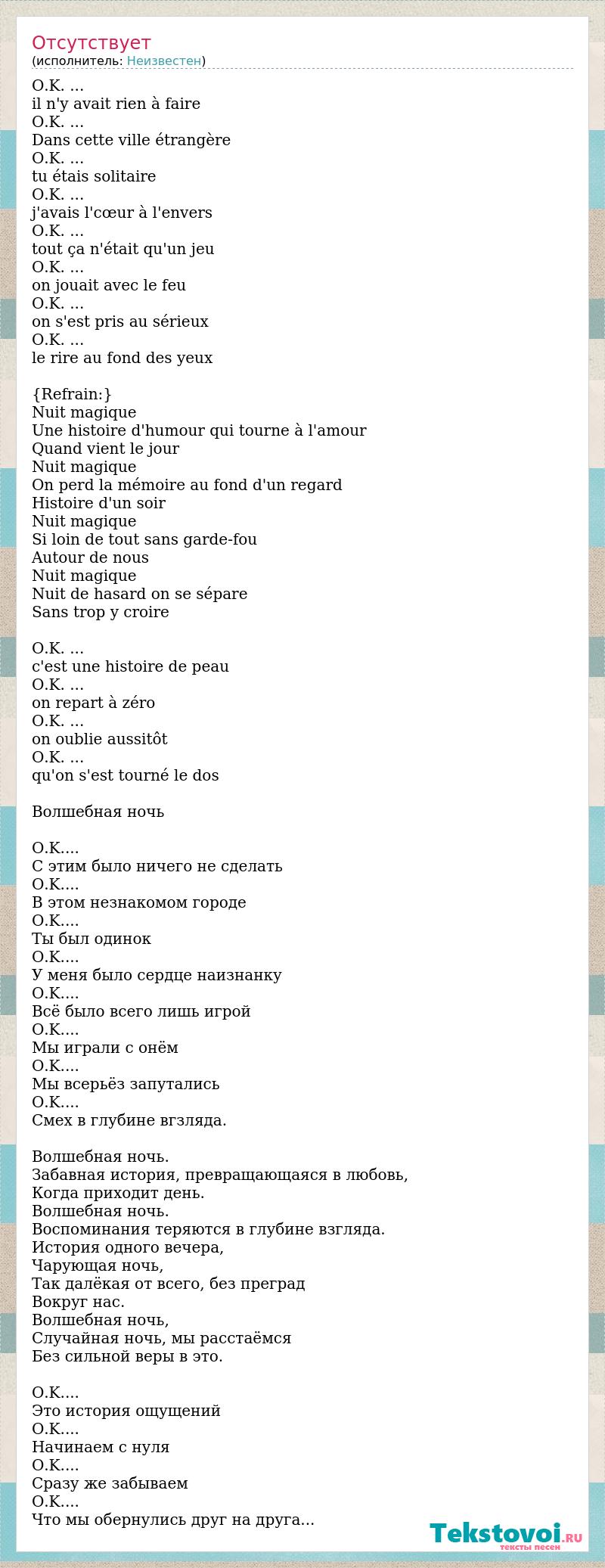 O.K. ... il n'y avait rien à faire O.K. ... Dans cette ville étrangère O.K. ... tu étais solitaire O.K. ... j'avais l'cœur à l'envers O.K. ... tout ça n'était qu'un jeu O.K. ... on jouait avec le feu O.K. ... on s'est pris au sérieux O.K. ... le rire au fond des yeux {Refrain:} Nuit magique Une histoire d'humour qui tourne à l'amour Quand vient le jour Nuit magique On perd la mémoire au fond d'un regard Histoire d'un soir Nuit magique Si loin de tout sans garde-fou Autour de nous Nuit magique Nuit de hasard on se sépare Sans trop y croire O.K. ... c'est une histoire de peau O.K. ... on repart à zéro O.K. ... on oublie aussitôt O.K. ... qu'on s'est tourné le dos Волшебная ночь O.K.... С этим было ничего не сделать O.K.... В этом незнакомом городе O.K.... Ты был одинок O.K.... У меня было сердце наизнанку O.K.... Всё было всего лишь игрой O.K.... Мы играли с онём O.K.... Мы всерьёз запутались O.K.... Смех в глубине вгзляда. Волшебная ночь. Забавная история, превращающаяся в любовь, Когда приходит день. Волшебная ночь. Воспоминания теряются в глубине взгляда. История одного вечера, Чарующая ночь, Так далёкая от всего, без преград Вокруг нас. Волшебная ночь, Случайная ночь, мы расстаёмся Без сильной веры в это. O.K.... Это история ощущений O.K.... Начинаем с нуля O.K.... Сразу же забываем O.K.... Что мы обернулись друг на друга...