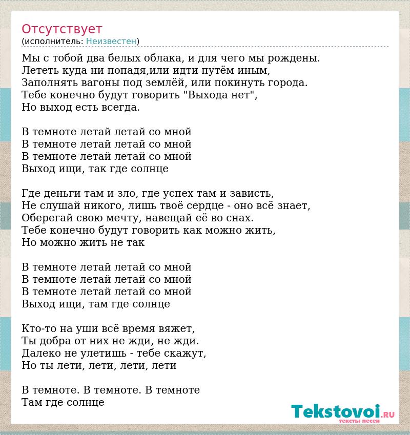 Мы с тобой два белых облака, и для чего мы рождены. Лететь куда ни попадя,или идти путём иным, Заполнять вагоны под землёй, или покинуть города. Тебе конечно будут говорить "Выхода нет", Но выход есть всегда. В темноте летай летай со мной В темноте летай летай со мной В темноте летай летай со мной Выход ищи, так где солнце Где деньги там и зло, где успех там и зависть, Не слушай никого, лишь твоё сердце - оно всё знает, Оберегай свою мечту, навещай её во снах. Тебе конечно будут говорить как можно жить, Но можно жить не так В темноте летай летай со мной В темноте летай летай со мной В темноте летай летай со мной Выход ищи, там где солнце Кто-то на уши всё время вяжет, Ты добра от них не жди, не жди. Далеко не улетишь - тебе скажут, Но ты лети, лети, лети, лети В темноте. В темноте. В темноте Там где солнце
