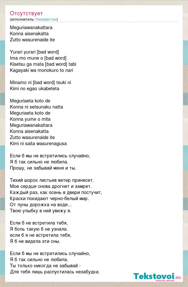Meguriawanakattara Konna aisenakatta Zutto wasurenaide ite Yurari yurari [bad word] Ima mo mune o [bad word] Kisetsu ga mata [bad word] tabi Kagayaki wa monokuro to nari Minamo ni [bad word] tsuki ni Kimi no egao ukabeteta Meguriaeta koto de Konna ni setsunaku natta Meguriaeta koto de Konna yume o mita Meguriawanakattara Konna aisenakatta Zutto wasurenaide ite Kimi ni saita wasurenagusa Если б мы не встретились случайно, Я б так сильно не любила. Прошу, не забывай меня и ты. Тихий шорох листьев ветер принесет. Мое сердце снова дрогнет и замрет. Каждый раз, как осень в двери постучит, Краски покидают черно-белый мир. От луны дорожка на воде... Твою улыбку в ней увижу я. Если б не встретила тебя, Я боль такую б не узнала. если б я не встретила тебя, Я б не видела эти сны. Если б мы не встретились случайно, Я б так сильно не любила. Ты только никогда не забывай - Для тебя лишь распустилась незабудка.