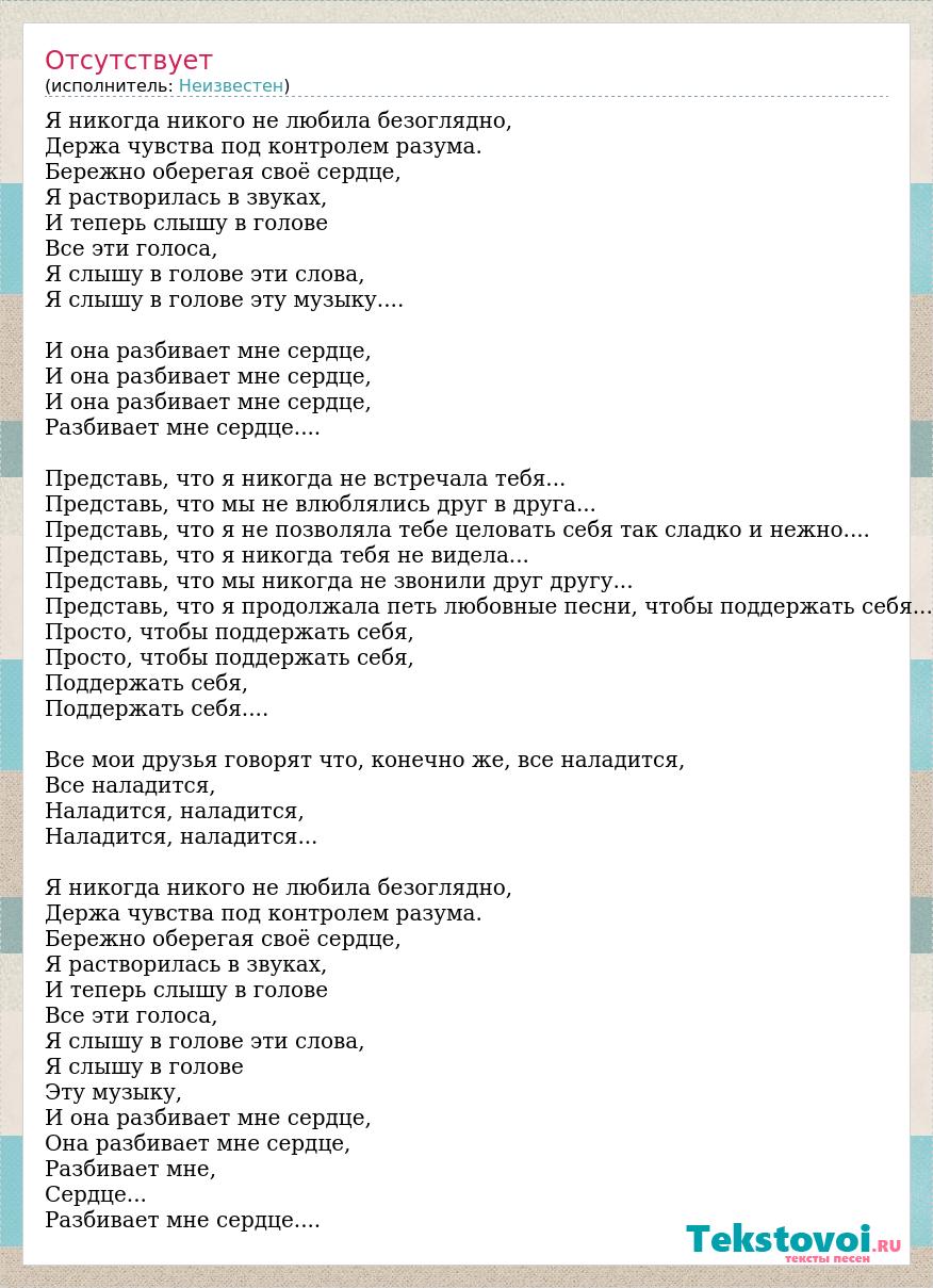 Я никогда никого не любила безоглядно, Держа чувства под контролем разума. Бережно оберегая своё сердце, Я растворилась в звуках, И теперь слышу в голове Все эти голоса, Я слышу в голове эти слова, Я слышу в голове эту музыку.... И она разбивает мне сердце, И она разбивает мне сердце, И она разбивает мне сердце, Разбивает мне сердце.... Представь, что я никогда не встречала тебя... Представь, что мы не влюблялись друг в друга... Представь, что я не позволяла тебе целовать себя так сладко и нежно.... Представь, что я никогда тебя не видела... Представь, что мы никогда не звонили друг другу... Представь, что я продолжала петь любовные песни, чтобы поддержать себя... Просто, чтобы поддержать себя, Просто, чтобы поддержать себя, Поддержать себя, Поддержать себя.... Все мои друзья говорят что, конечно же, все наладится, Все наладится, Наладится, наладится, Наладится, наладится... Я никогда никого не любила безоглядно, Держа чувства под контролем разума. Бережно оберегая своё сердце, Я растворилась в звуках, И теперь слышу в голове Все эти голоса, Я слышу в голове эти слова, Я слышу в голове Эту музыку, И она разбивает мне сердце, Она разбивает мне сердце, Разбивает мне, Сердце... Разбивает мне сердце....