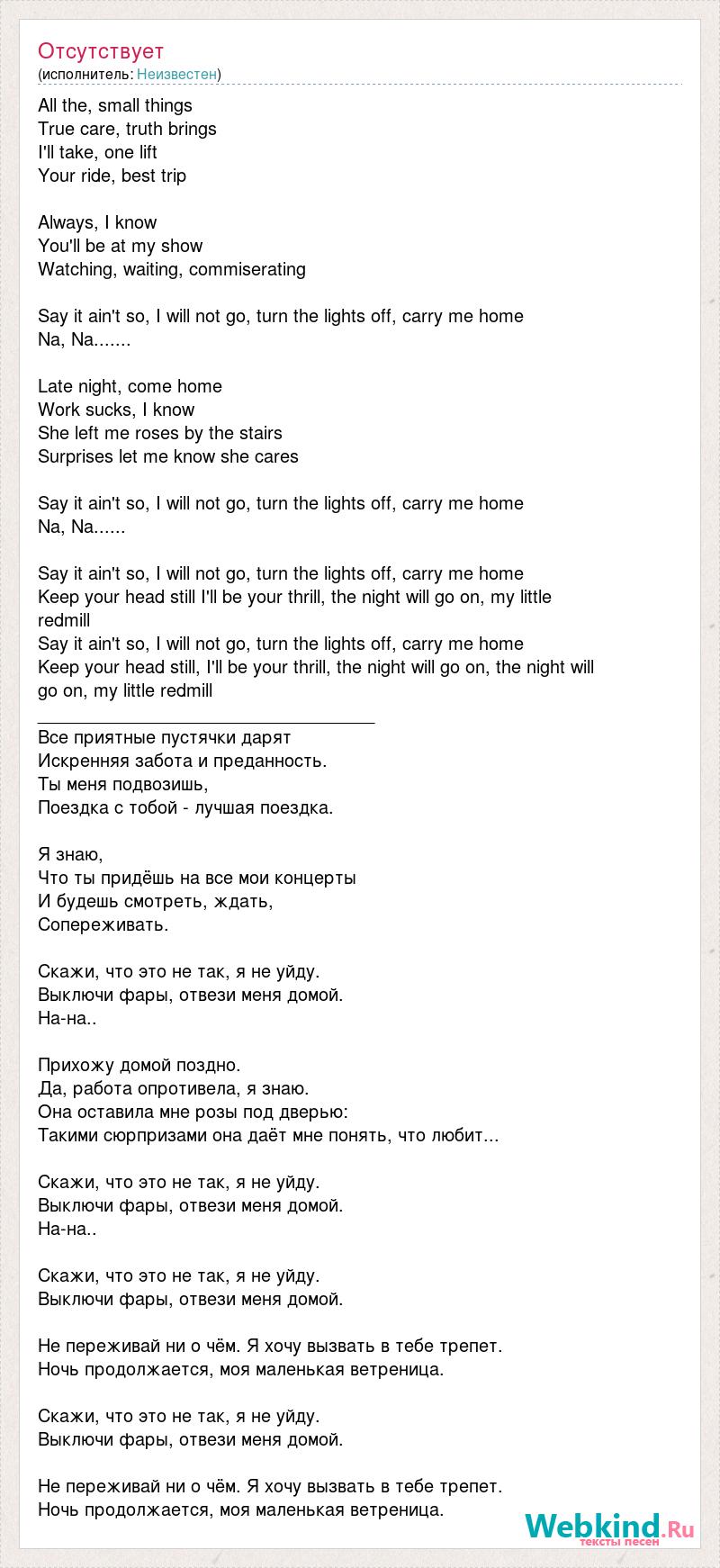 All the, small things [bad word] care, [bad word] brings I'll take, one lift Your ride, best trip Always, I know You'll be at my show Watching, [bad word] Say it ain't so, I will not go, turn the lights off, carry me home Na, Na....... Late [bad word] home Work sucks, I know She left me roses by the stairs Surprises let me know she cares Say it ain't so, I will not go, turn the lights off, carry me home Na, Na...... Say it ain't so, I will not go, turn the lights off, carry me home Keep your head still I'll be your thrill, the night will go on, my little redmill Say it ain't so, I will not go, turn the lights off, carry me home Keep your head still, I'll be your thrill, the night will go on, the night will go on, my little redmill __________________________________ Все приятные пустячки дарят Искренняя забота и преданность. Ты меня подвозишь, Поездка с тобой - лучшая поездка. Я знаю, Что ты придёшь на все мои концерты И будешь смотреть, ждать, Cопереживать. Скажи, что это не так, я не уйду. Выключи фары, отвези меня домой. На-на.. Прихожу домой поздно. Да, работа опротивела, я знаю. Она оставила мне розы под дверью: Такими сюрпризами она даёт мне понять, что любит... Скажи, что это не так, я не уйду. Выключи фары, отвези меня домой. На-на.. Скажи, что это не так, я не уйду. Выключи фары, отвези меня домой. Не переживай ни о чём. Я хочу вызвать в тебе трепет. Ночь продолжается, моя маленькая ветреница. Скажи, что это не так, я не уйду. Выключи фары, отвези меня домой. Не переживай ни о чём. Я хочу вызвать в тебе трепет. Ночь продолжается, моя маленькая ветреница.
