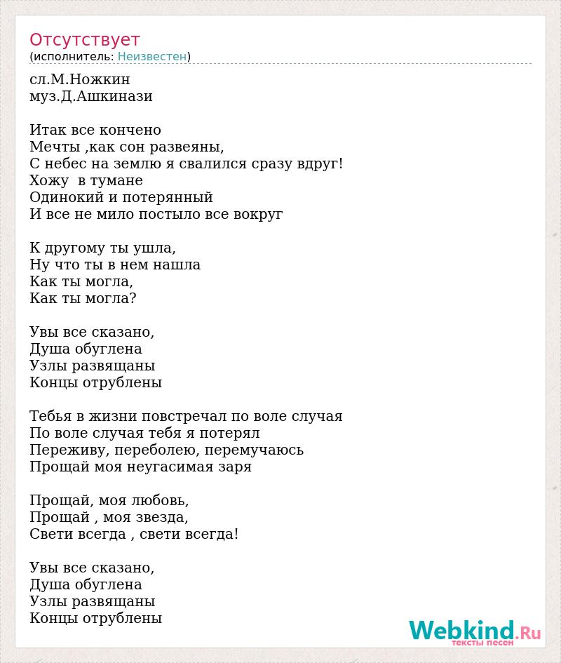 сл.М.Ножкин муз.Д.Ашкинази Итак все кончено Мечты ,как сон развеяны, С небес на землю я свалился сразу вдруг! Хожу в тумане Одинокий и потерянный И все не мило постыло все вокруг К другому ты ушла, Ну что ты в нем нашла Как ты могла, Как ты могла? Увы все сказано, Душа обуглена Узлы развящаны Концы отрублены Тебья в жизни повстречал по воле случая По воле случая тебя я потерял Переживу, переболею, перемучаюсь Прощай моя неугасимая заря Прощай, моя любовь, Прощай , моя звезда, Свети всегда , свети всегда! Увы все сказано, Душа обуглена Узлы развящаны Концы отрублены