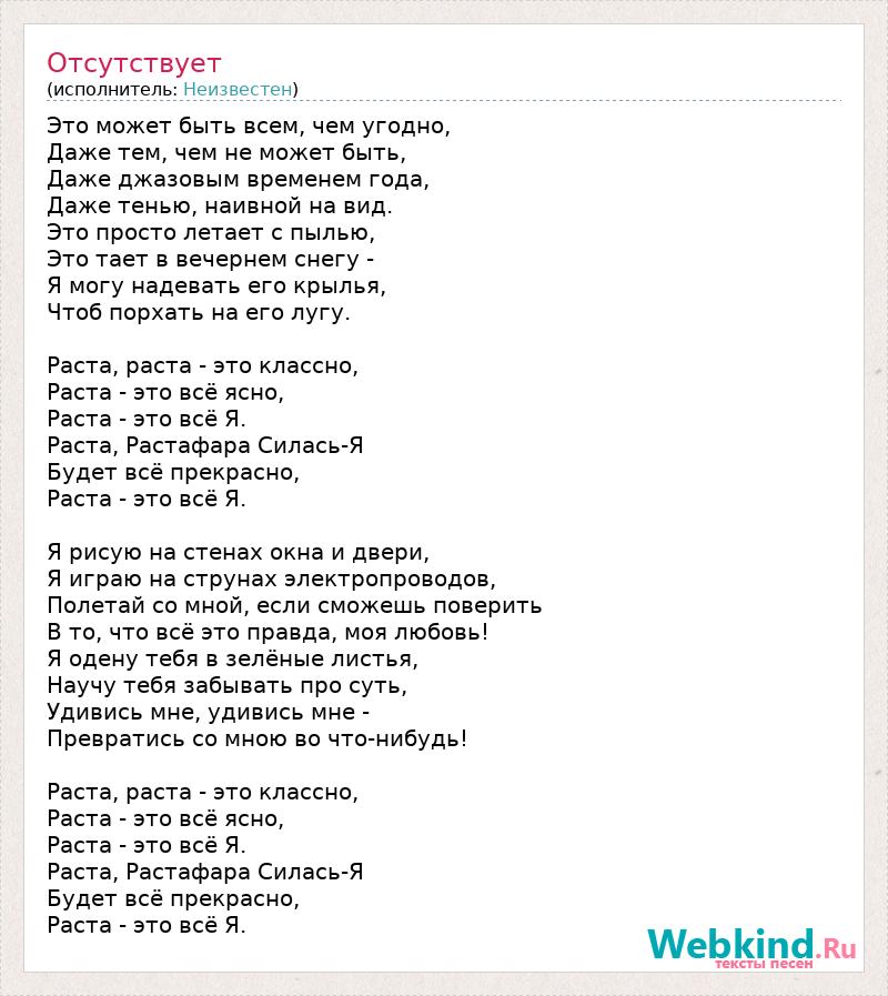 Это может быть всем, чем угодно, Даже тем, чем не может быть, Даже джазовым временем года, Даже тенью, наивной на вид. Это просто летает с пылью, Это тает в вечернем снегу - Я могу надевать его крылья, Чтоб порхать на его лугу. Раста, раста - это классно, Раста - это всё ясно, Раста - это всё Я. Раста, Растафара Силась-Я Будет всё прекрасно, Раста - это всё Я. Я рисую на стенах окна и двери, Я играю на струнах электропроводов, Полетай со мной, если сможешь поверить В то, что всё это правда, моя любовь! Я одену тебя в зелёные листья, Научу тебя забывать про суть, Удивись мне, удивись мне - Превратись со мною во что-нибудь! Раста, раста - это классно, Раста - это всё ясно, Раста - это всё Я. Раста, Растафара Силась-Я Будет всё прекрасно, Раста - это всё Я.