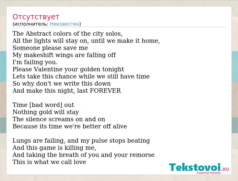 The Abstract colors of the city solos, All the lights will stay on, until we make it home, Someone please save me My makeshift wings are falling off I'm failing you. Please Valentine your golden tonight Lets take this chance while we still have time So why don't we write this down And make this night, last FOREVER Time [bad word] out Nothing gold will stay The silence screams on and on Because its time we're better off alive Lungs are failing, and my pulse stops beating And this game is killing me, And taking the breath of you and your remorse This is what we call love