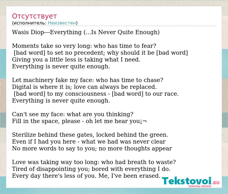 Wasis Diop---Everything (...Is Never Quite Enough) Moments take so very long: who has time to fear? [bad word] to set no precedent; why should it be [bad word] Giving you a little less is taking what I need. Everything is never quite enough. Let machinery fake my face: who has time to chase? Digital is where it is; love can always be replaced. [bad word] to my consciousness - [bad word] to our race. Everything is never quite enough. Can't see my face: what are you thinking? Fill in the space, please - oh let me hear you¡¬ Sterilize behind these gates, locked behind the green. Even if I had you here - what we had was never clear No more words to say to you; no more thoughts appear Love was taking way too long: who had breath to waste? Tired of disappointing you; bored with everything I do. Every day there's less of you. Me, I've been erased.