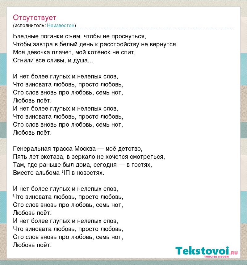 Бледные поганки съем, чтобы не проснуться, Чтобы завтра в белый день к расстройству не вернутся. Моя девочка плачет, мой котёнок не спит, Сгнили все сливы, и душа... И нет более глупых и нелепых слов, Что виновата любовь, просто любовь, Сто слов вновь про любовь, семь нот, Любовь поёт. И нет более глупых и нелепых слов, Что виновата любовь, просто любовь, Сто слов вновь про любовь, семь нот, Любовь поёт. Генеральная трасса Москва — моё детство, Пять лет экстаза, в зеркало не хочется смотреться, Там, где раньше был дома, сегодня — в гостях, Вместо альбома ЧП в новостях. И нет более глупых и нелепых слов, Что виновата любовь, просто любовь, Сто слов вновь про любовь, семь нот, Любовь поёт. И нет более глупых и нелепых слов, Что виновата любовь, просто любовь, Сто слов вновь про любовь, семь нот, Любовь поёт.