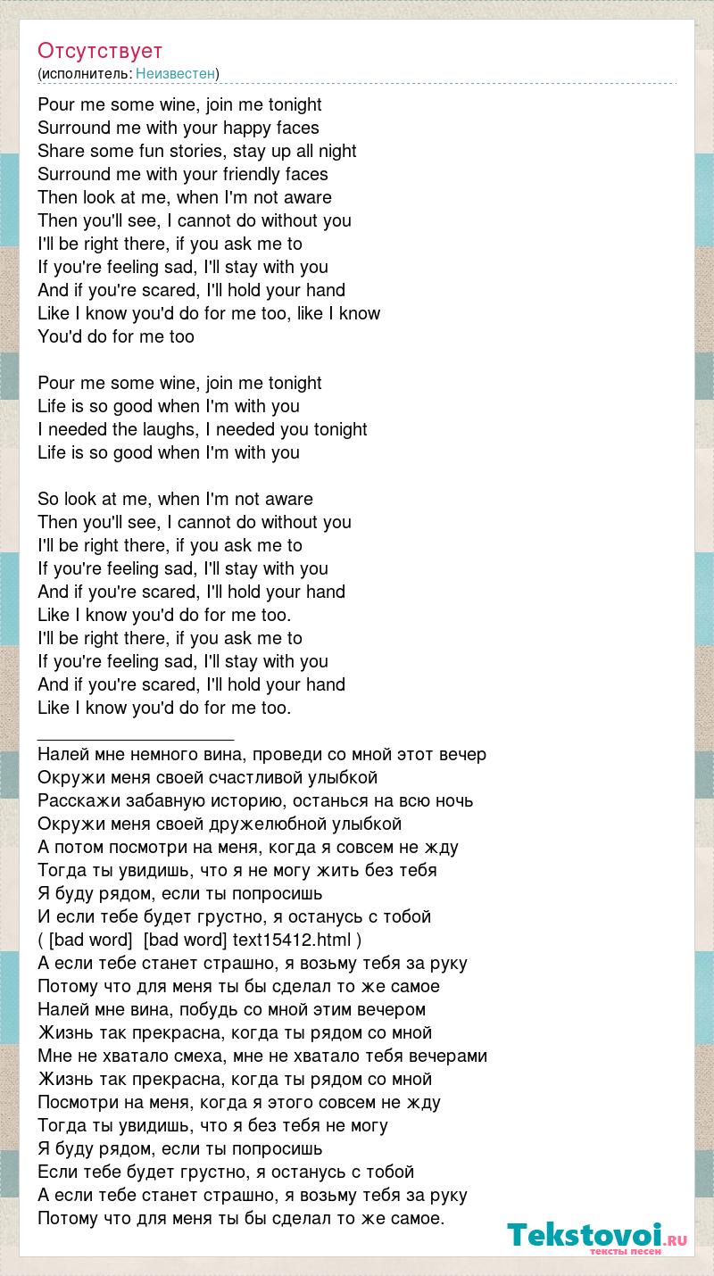 Pour me some wine, join me tonight Surround me with your happy faces Share some fun stories, stay up all night Surround me with your friendly faces Then look at me, when I'm not aware Then you'll see, I cannot do without you I'll be right there, if you ask me to If you're feeling sad, I'll stay with you And if you're scared, I'll hold your hand Like I know you'd do for me too, like I know You'd do for me too Pour me some wine, join me tonight Life is so good when I'm with you I needed the laughs, I needed you tonight Life is so good when I'm with you So look at me, when I'm not aware Then you'll see, I cannot do without you I'll be right there, if you ask me to If you're feeling sad, I'll stay with you And if you're scared, I'll hold your hand Like I know you'd do for me too. I'll be right there, if you ask me to If you're feeling sad, I'll stay with you And if you're scared, I'll hold your hand Like I know you'd do for me too. ____________________ Налей мне немного вина, проведи со мной этот вечер Окружи меня своей счастливой улыбкой Расскажи забавную историю, останься на всю ночь Окружи меня своей дружелюбной улыбкой А потом посмотри на меня, когда я совсем не жду Тогда ты увидишь, что я не могу жить без тебя Я буду рядом, если ты попросишь И если тебе будет грустно, я останусь с тобой ( [bad word] [bad word] text15412.html ) А если тебе станет страшно, я возьму тебя за руку Потому что для меня ты бы сделал то же самое Налей мне вина, побудь со мной этим вечером Жизнь так прекрасна, когда ты рядом со мной Мне не хватало смеха, мне не хватало тебя вечерами Жизнь так прекрасна, когда ты рядом со мной Посмотри на меня, когда я этого совсем не жду Тогда ты увидишь, что я без тебя не могу Я буду рядом, если ты попросишь Если тебе будет грустно, я останусь с тобой А если тебе станет страшно, я возьму тебя за руку Потому что для меня ты бы сделал то же самое.