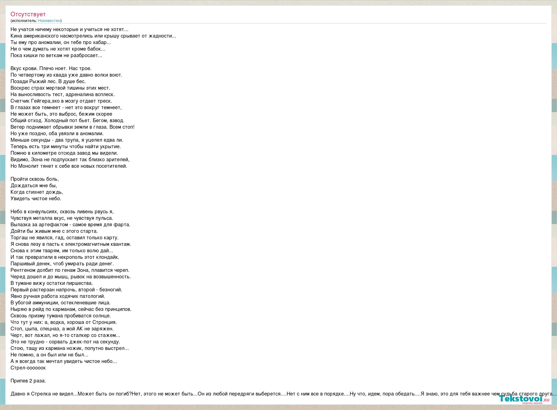 Не учатся ничему некоторые и учиться не хотят... Кина американского насмотрелись или крышу срывает от жадности... Ты ему про аномалии, он тебе про хабар... Ни о чем думать не хотят кроме бабок... Пока кишки по веткам не разбросает... Вкус крови. Плечо ноет. Нас трое. По четвертому из квада уже давно волки воют. Позади Рыжий леc. В душе бес. Воскрес страх мертвой тишины этих мест. На выносливость тест, адреналина всплеск. Счетчик Гейгера,эхо в мозгу отдает треск. В глазах все темнеет - нет это вокруг темнеет, Не может быть, это выброс, бежим скорее Общий отход. Холодный пот бьет. Бегом, взвод. Ветер поднимает обрывки земли в глаза. Всем стоп! Но уже поздно, оба увязли в аномалии. Меньше секунды - два трупа, я уцелел едва ли. Теперь есть три минуты чтобы найти укрытие. Помню в километре отсюда завод мы видели. Видимо, Зона не подпускает так близко зрителей, Но Монолит тянет к себе все новых посетителей. Пройти сквозь боль, Дождаться мне бы, Когда стихнет дождь, Увидеть чистое небо. Небо в конвульсиях, сквозь ливень рвусь я, Чувствуя металла вкус, не чувствуя пульса. Вылазка за артефактом - самое время для фарта. Дойти бы живым мне с этого старта. Торгаш не явился, гад, оставил только карту. Я снова лезу в пасть к электромагнитным квантам. Снова к этим тварям, им только волю дай... И так превратили в некрополь этот клондайк. Паршивый денек, чтоб умирать ради денег. Рентгеном долбит по генам Зона, плавится череп. Черед дошел и до мышц, рывок на возвышенность. В тумане вижу остатки пиршества. Первый растерзан напрочь, второй - безногий. Явно ручная работа ходячих патологий. В убогой аммуниции, остекленевшие лица. Ныряю в рейд по карманам, сейчас без принципов. Сквозь призму тумана пробиватся солнце. Что тут у них: а, водка, хороша от Стронция. Стоп, цыпа, спецназ, а мой АК не заряжен. Черт, вот лажал, но я-то сталкер со стажем... Это не трудно - сорвать джек-пот на секунду. Стою, тащу из кармана ножик, попутно выстрел... Не помню, а он был или не был... А я всегда так мечтал увидеть чистое небо... Стрел-оооооок Припев 2 раза. Давно я Стрелка не видел...Может быть он погиб?Нет, этого не может быть...Он из любой передряги выберется....Нет с ним все в порядке....Ну что, идем, пора обедать....Я знаю, это для тебя важнее чем судьба старого друга...