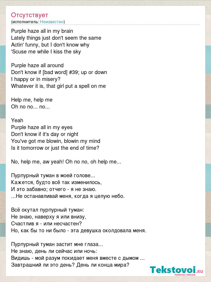 Purple haze all in my brain Lately things just don't seem the same Actin' funny, but I don't know why 'Scuse me while I kiss the sky Purple haze all around Don't know if [bad word] #39; up or down I happy or in misery? Whatever it is, that girl put a spell on me Help me, help me Oh no no... no... Yeah Purple haze all in my eyes Don't know if it's day or night You've got me blowin, blowin my mind Is it tomorrow or just the end of time? No, help me, aw yeah! Oh no no, oh help me... Пурпурный туман в моей голове... Кажется, будто всё так изменилось, И это забавно; отчего - я не знаю. ...Не останавливай меня, когда я целую небо. Всё окутал пурпурный туман: Не знаю, наверху я или внизу, Счастлив я - или несчастен? Но, как бы то ни было - эта девушка околдовала меня. Пурпурный туман застит мне глаза... Не знаю, день ли сейчас или ночь: Видишь - мой разум покидает меня вместе с дымом ... Завтрашний ли это день? День ли конца мира?