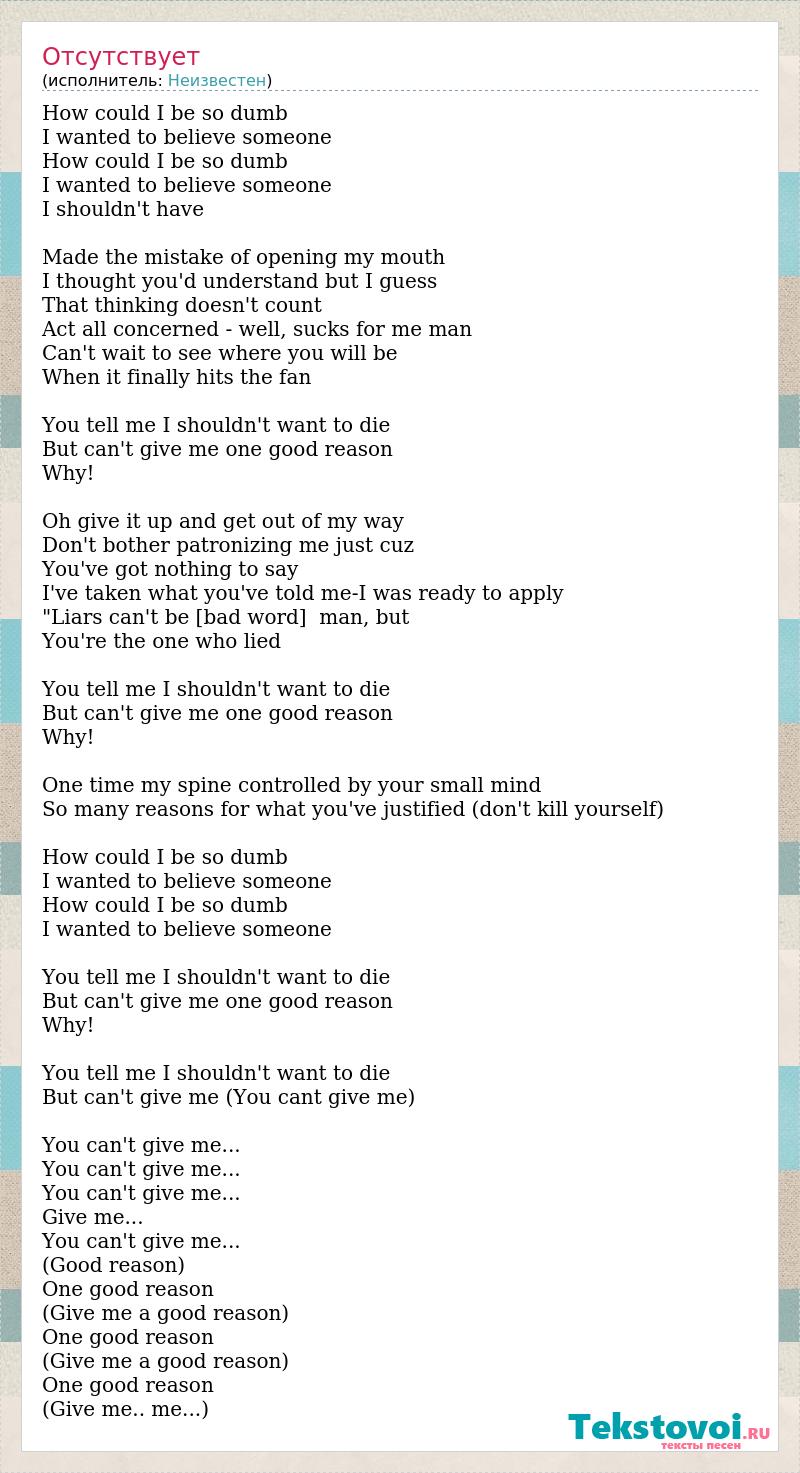 How could I be so dumb I wanted to believe someone How could I be so dumb I wanted to believe someone I shouldn't have Made the mistake of opening my mouth I thought you'd understand but I guess That thinking doesn't count Act all concerned - well, sucks for me man Can't wait to see where you will be When it finally hits the fan You tell me I shouldn't want to die But can't give me one good reason Why! Oh give it up and get out of my way Don't bother patronizing me just cuz You've got nothing to say I've taken what you've told me-I was ready to apply "Liars can't be [bad word] man, but You're the one who lied You tell me I shouldn't want to die But can't give me one good reason Why! One time my spine controlled by your small mind So many reasons for what you've justified (don't kill yourself) How could I be so dumb I wanted to believe someone How could I be so dumb I wanted to believe someone You tell me I shouldn't want to die But can't give me one good reason Why! You tell me I shouldn't want to die But can't give me (You cant give me) You can't give me... You can't give me... You can't give me... Give me... You can't give me... (Good reason) One good reason (Give me a good reason) One good reason (Give me a good reason) One good reason (Give me.. me...)