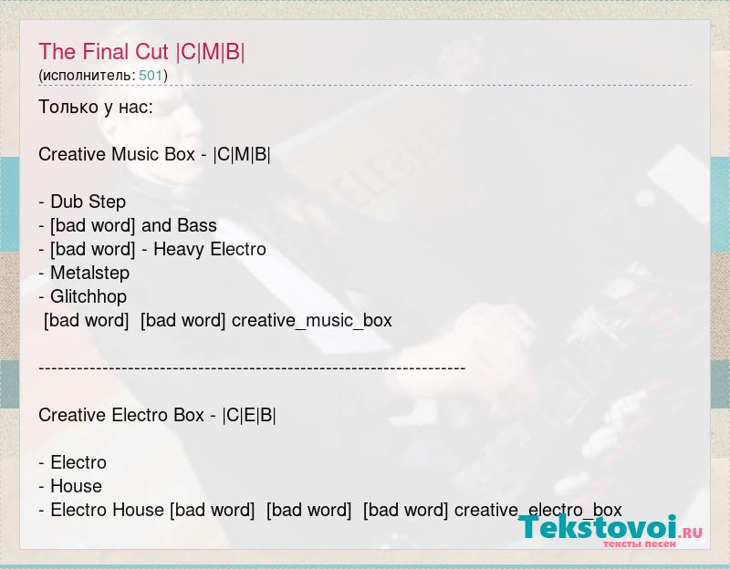 Только у нас: Creative Music Box - |C|M|B| - Dub Step - [bad word] and Bass - [bad word] - Heavy Electro - Metalstep - Glitchhop [bad word] [bad word] creative_music_box ------------------------------------------------------------------- Creative Electro Box - |C|E|B| - Electro - House - Electro House [bad word] [bad word] [bad word] creative_electro_box
