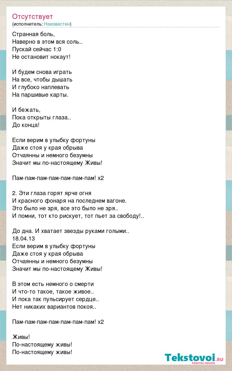 Странная боль, Наверно в этом вся соль.. Пускай сейчас 1:0 Не остановит нокаут! И будем снова играть На все, чтобы дышать И глубоко наплевать На паршивые карты. И бежать, Пока открыты глаза.. До конца! Если верим в улыбку фортуны Даже стоя у края обрыва Отчаянны и немного безумны Значит мы по-настоящему Живы! Пам-пам-пам-пам-пам-пам-пам! х2 2. Эти глаза горят ярче огня И красного фонаря на последнем вагоне. Это было не зря, все это было не зря.. И помни, тот кто рискует, тот пьет за свободу!.. До дна. И хватает звезды руками голыми.. 18.04.13 Если верим в улыбку фортуны Даже стоя у края обрыва Отчаянны и немного безумны Значит мы по-настоящему Живы! В этом есть немного о смерти И что-то такое, такое живое.. И пока так пульсирует сердце.. Нет никаких вариантов покоя.. Пам-пам-пам-пам-пам-пам-пам! х2 Живы! По-настоящему живы! По-настоящему живы!