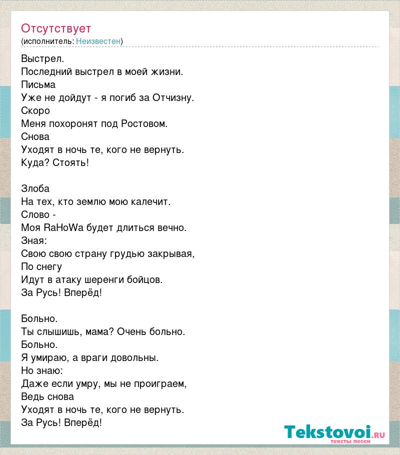 Выстрел. Последний выстрел в моей жизни. Письма Уже не дойдут - я погиб за Отчизну. Скоро Меня похоронят под Ростовом. Снова Уходят в ночь те, кого не вернуть. Куда? Стоять! Злоба На тех, кто землю мою калечит. Слово - Моя RaHoWa будет длиться вечно. Зная: Свою свою страну грудью закрывая, По снегу Идут в атаку шеренги бойцов. За Русь! Вперёд! Больно. Ты слышишь, мама? Очень больно. Больно. Я умираю, а враги довольны. Но знаю: Даже если умру, мы не проиграем, Ведь снова Уходят в ночь те, кого не вернуть. За Русь! Вперёд!