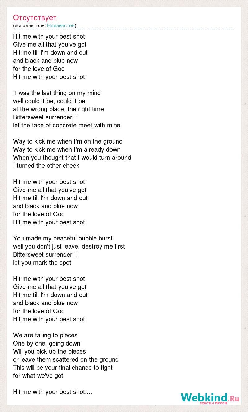 Hit me with your best shot Give me all that you've got Hit me till I'm down and out and black and blue now for the love of God Hit me with your best shot It was the last thing on my mind well could it be, could it be at the wrong place, the right time Bittersweet surrender, I let the face of concrete meet with mine Way to kick me when I'm on the ground Way to kick me when I'm already down When you thought that I would turn around I turned the other cheek Hit me with your best shot Give me all that you've got Hit me till I'm down and out and black and blue now for the love of God Hit me with your best shot You made my peaceful bubble burst well you don't just leave, destroy me first Bittersweet surrender, I let you mark the spot Hit me with your best shot Give me all that you've got Hit me till I'm down and out and black and blue now for the love of God Hit me with your best shot We are falling to pieces One by one, going down Will you pick up the pieces or leave them scattered on the ground This will be your final chance to fight for what we've got Hit me with your best shot....