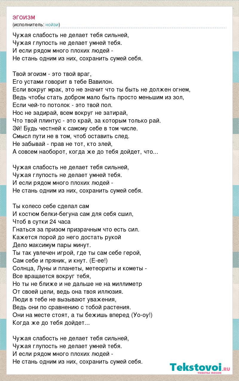 Чужая слабость не делает тебя сильней, Чужая глупость не делает умней тебя. И если рядом много плохих людей - Не стань одним из них, сохранить сумей себя. Твой эгоизм - это твой враг, Его устами говорит в тебе Вавилон. Если вокруг мрак, это не значит что ты быть не должен огнем, Ведь чтобы стать добром мало быть просто меньшим из зол, Если чей-то потолок - это твой пол. Нос не задирай, всем вокруг не затирай, Что твой плинтус - это край, за которым только рай. Эй! Будь честней к самому себе в том числе. Смысл пути не в том, чтоб оставить след. Не забывай - прав не тот, кто злей, А совсем наоборот, когда же до тебя дойдет, что... Чужая слабость не делает тебя сильней, Чужая глупость не делает умней тебя. И если рядом много плохих людей - Не стань одним из них, сохранить сумей себя. Ты колесо себе сделал сам И костюм белки-бегуна сам для себя сшил, Чтоб в сутки 24 часа Гнаться за призом призрачным что есть сил. Кажется порой до него достать рукой Дело максимум пары минут. Ты так увлечен игрой, где ты сам себе герой, Сам себе и пряник, и кнут. (Е-ее!) Солнца, Луны и планеты, метеориты и кометы - Все вращается вокруг тебя, Но ты не ближе и не дальше не на миллиметр От своей цели, ведь она твоя иллюзия. Люди в тебе не вызывают уважения, Ведь они по сравнению с тобой растения. Они на месте стоят, а ты бежишь вперед (Уо-оу!) Когда же до тебя дойдет... Чужая слабость не делает тебя сильней, Чужая глупость не делает умней тебя. И если рядом много плохих людей - Не стань одним из них, сохранить сумей себя.